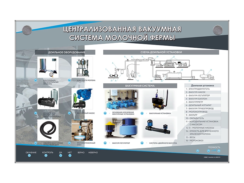 Интерактивный стенд предназначен для получения знаний о централизованной вакуумной системе молочной фермы, а также о ее основных конструктивных элементах.Комплектация