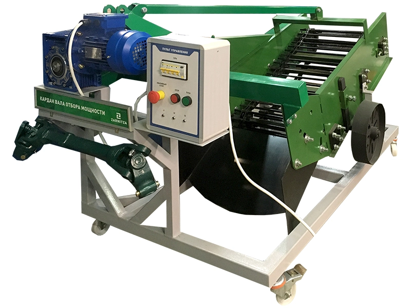 Стенд представляет собой полнокомплектный картофелекопатель для мини-трактора, адаптированный для учебного процесса, закрепленный на металлическом основании с электроприводом и панелью управления.