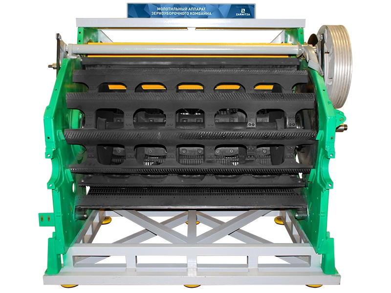 Стенд представляет собой натуральные элементы молотильного аппарата зерноуборочного комбайна, адаптированные для учебного процесса. Молотильный аппарат зерноуборочного комбайна установлен на металлическом основании, окрашенном полимерной износоустойчивой эмалью.
