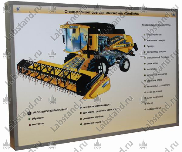 Назначение: Стенд-планшет предназначен для изучения принципа действия приборов и составных элементов комбайна New Holland в учебном курсе «Уборочные машины».