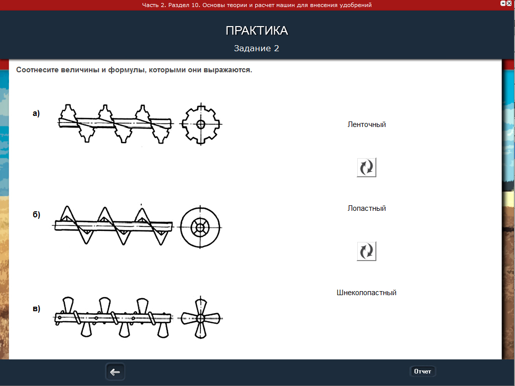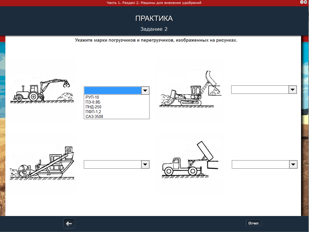 Индивидуальные итоговые тесты для каждого пользователя – к 1-й и 2-й частям курса. При каждом входе в программу из базовых вопросов методом случайного выбора формируются тесты с неповторимой комбинацией заданий. Для 1-й части курса предусмотрено 265 базовых вопросов, для 2-й – 364. По окончании тестирования показывается отчет с указанием количества баллов, итоговой оценкой и временем прохождения теста.