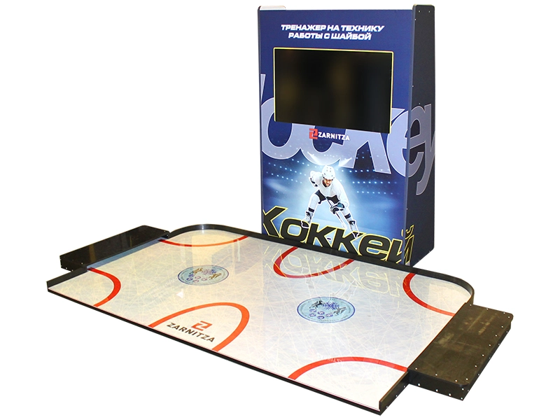 Поле предназначено для отработки тренировочных упражнений. Основание и поверхность интерактивного поля выполнены из высококачественных, ударопрочных и нетоксичных материалов. Поле снабжено отбойно-возвратными панелями, выполненными на основе троса, обеспечивающими стабильный возврат шайбы с минимальной потерей энергии. На поле перед зонами установки возвратно-отбойных панелей распложены датчики определения положения специальной шайбы.