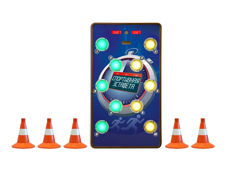 Многофункциональный спортивно-игровой комплекс "Спортивная эстафета" представляет собой комплект спортивно-игрового оборудования, состоящий из яркой функциональной игровой панели с нанесенным на его поверхность информационным тематическим изображением, информационного табло и десяти механических ударно-нажимных элементов, имеющих светодиодную подсветку, позволяющую при помощи цветовой и звуковой индикации визуализировать порядок и правильность выполнения спортивных заданий. В состав многофункционального комплекса также входят дополнительное спортивное оборудование и инвентарь, обеспечивающие проведение различных спортивных и реабилитационных мероприятий.
