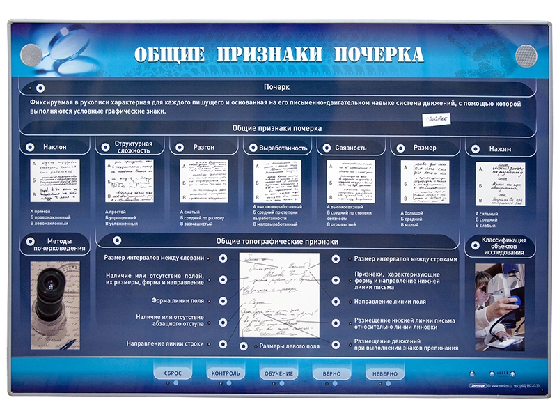 Стенд предназначен для изучения общих признаков почерка курсантами специализированных учебных заведений.