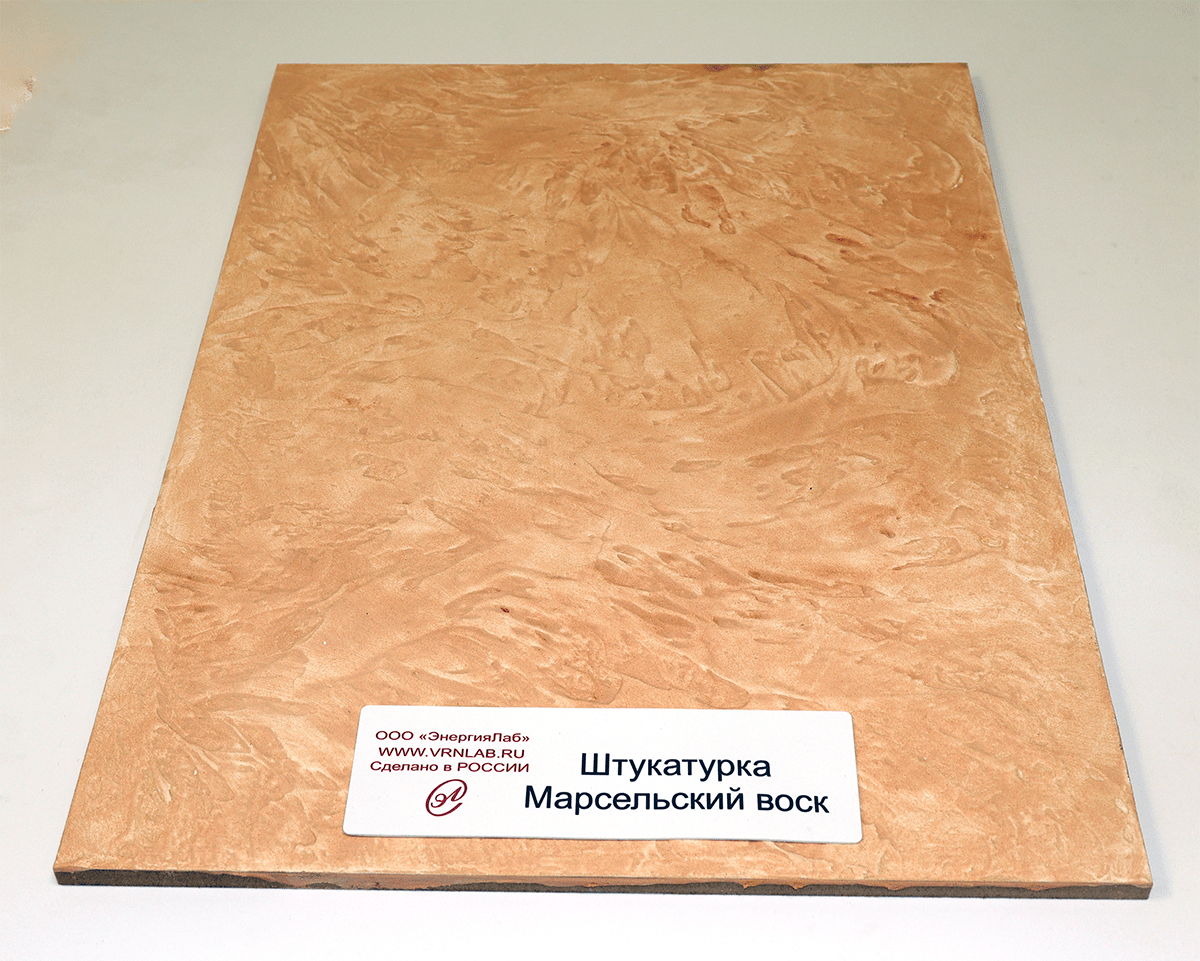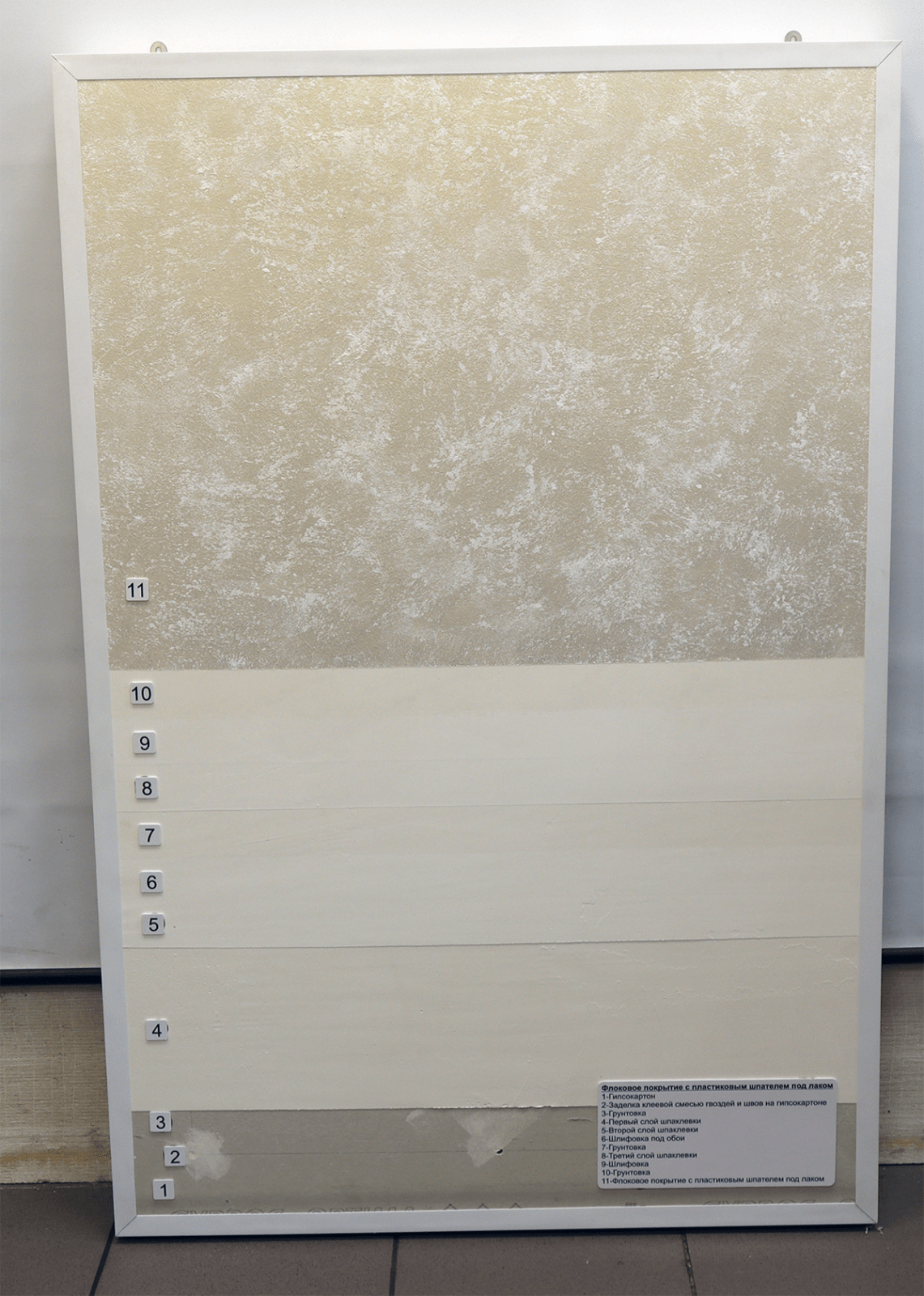 - Образец штукатурки нанесен на деревянную табличку, закрепленную на композитной панели.
