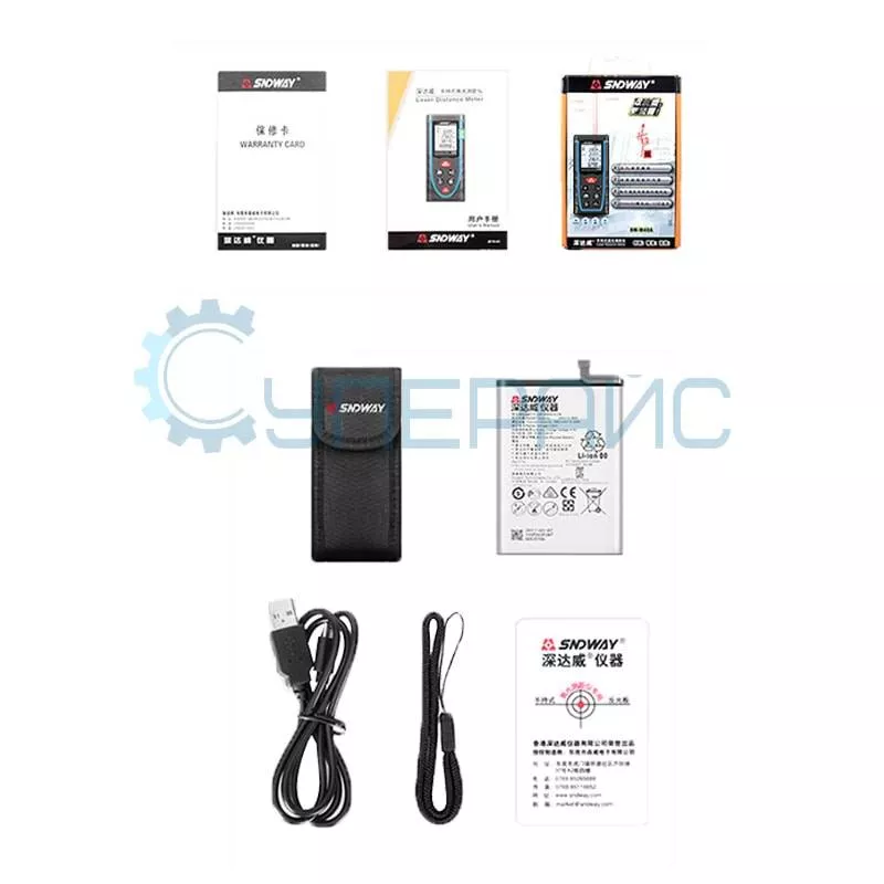 Комплектация | лазерный дальномер SNDWAY SW-G40A – 1 шт USB-кабель – 1 шт литиевый аккумулятор – 1 шт наручный ремень – 1 шт отражательные тестеры – 1 шт поясной чехол – 1 шт инструкция по эксплуатации – 1 шт |