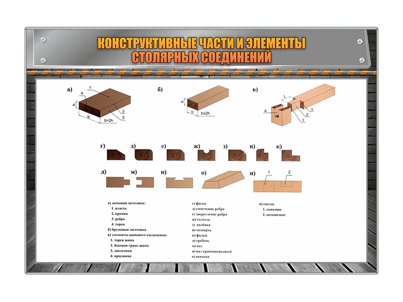 Стенд представляет собой информационную панель, на которой изображены конструктивные части и элементы столярных соединений.