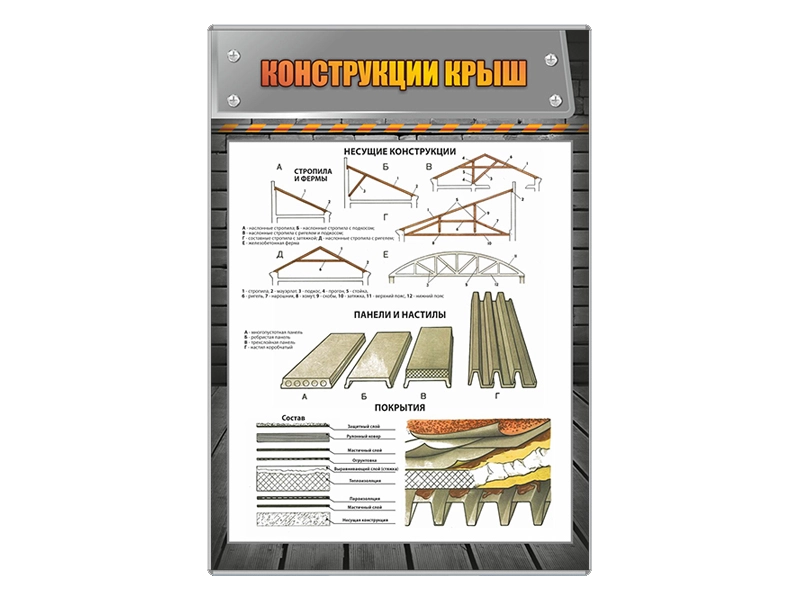 Стенд представляет собой информационную панель, на которой размещены сведения о конструкции крыш.