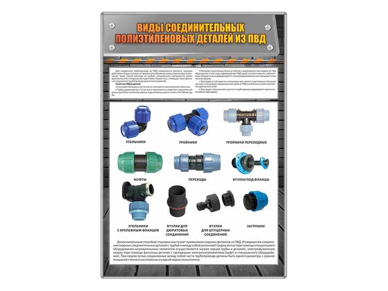 Стенд представляет собой информационную панель, на которой размещены сведения о видах соединительных полиэтиленовых деталей из ПВД.