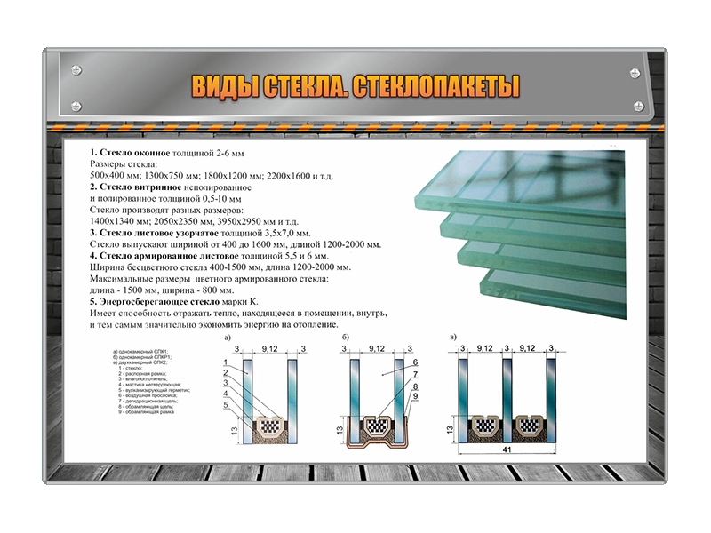 Стенд представляет собой информационную панель, на которой размещены сведения о видах стекла и стеклопакетах.