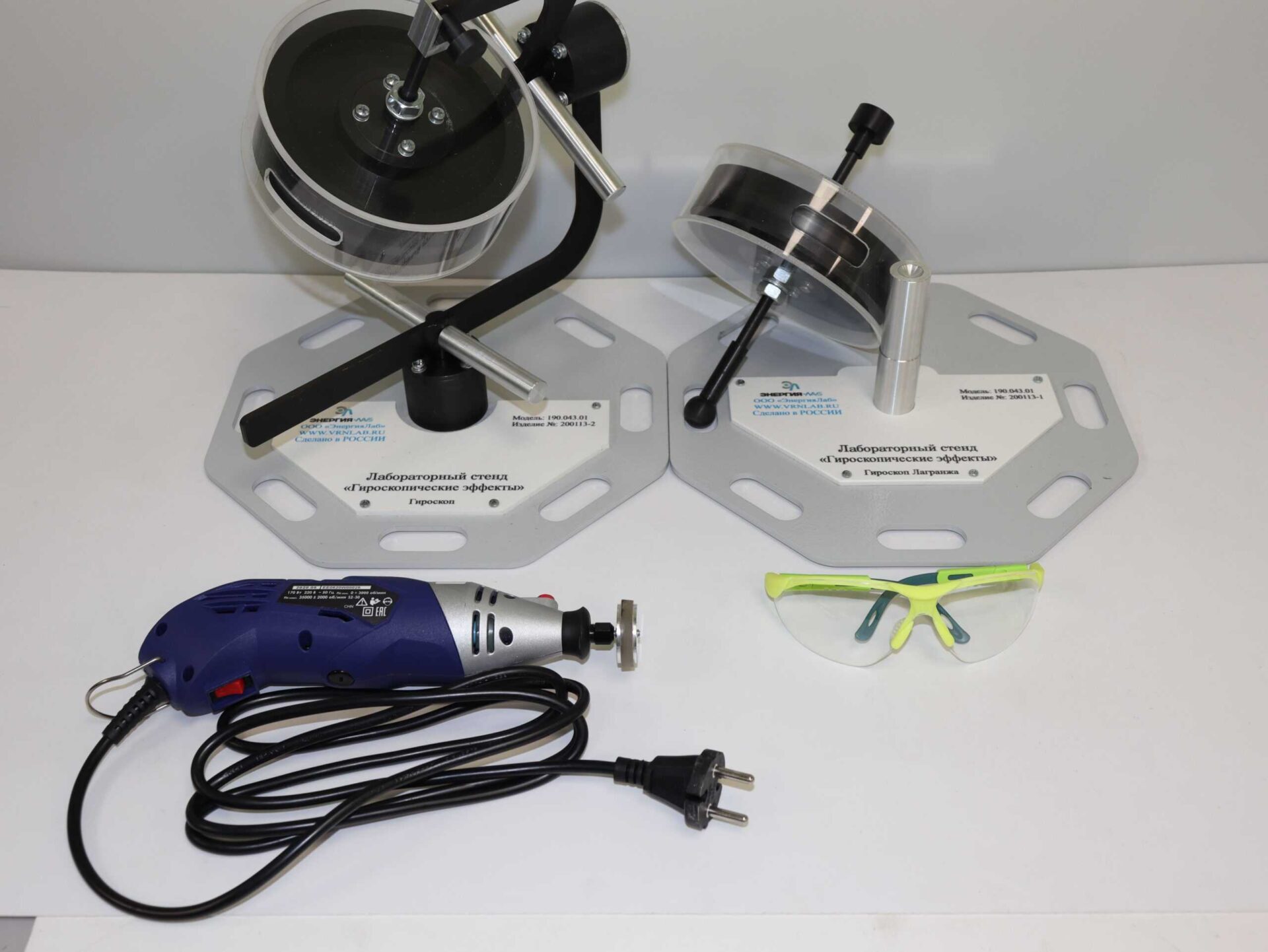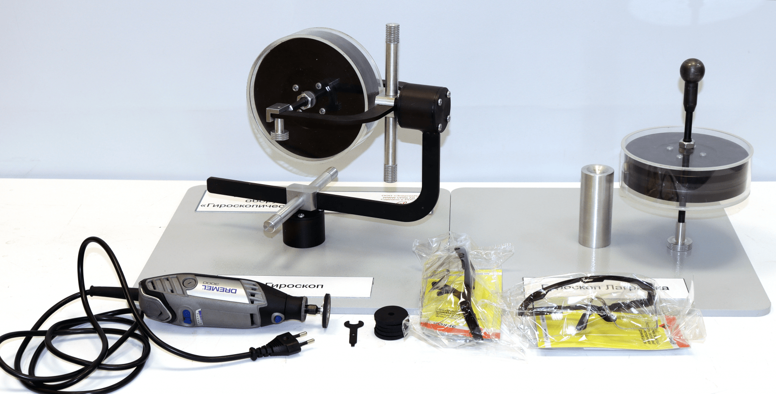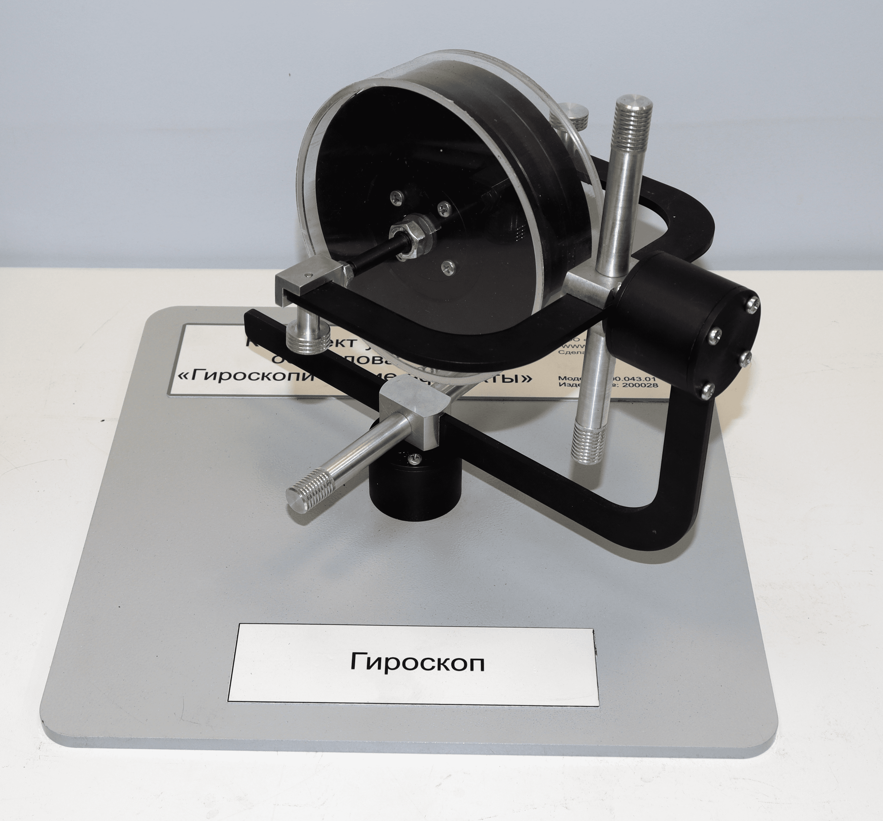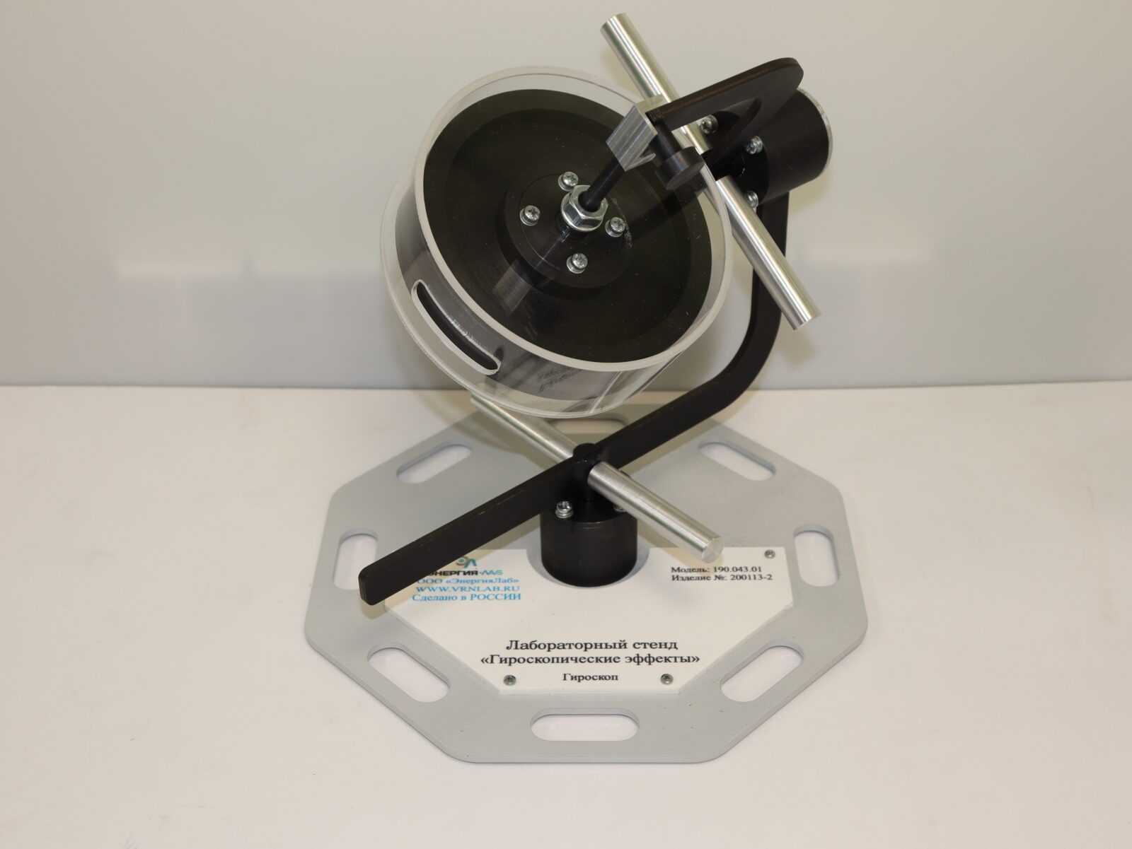 Лабораторный стенд "Гироскопические эффекты" предназначен для проведения лабораторных работ по изучению явлений, проявляющихся при различных воздействиях на быстровращающийся диск. Одновременно работы проводятся с группой из 2, 3 обучаемых. Комплект выполнен согласно ТУ 32.99.53–001–09519063–2019 и имеет соответствующий сертификат производителя ГОСТ Р и сертификат качества ИСО 9001-2015 на данный вид продукции.