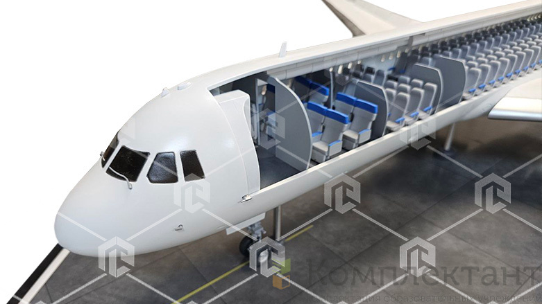 Данный учебный комплекс позволяет с помощью действующего физического макета изучить внешнее и внутреннее устройство самолёта. На макете представлена часть силового каркаса состоящая из шпангоутов и стрингеров. На модели можно реализовать механизацию рулей самолёта, а также показать расположение электрических, топливных, пневматических магистралей. Кроме того, можно показать внутреннее убранство объекта, а также расположение различных блоков, не видимых на макете с обшивкой.