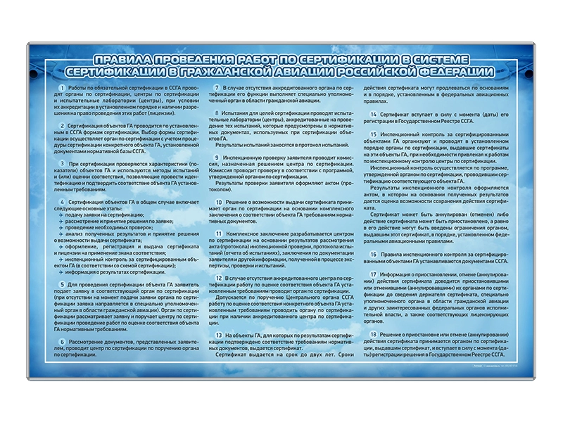 Стенд «Правила проведения работ по сертификации в системе сертификации в гражданской авиации РФ» представляет собой информационную панель, на которой размещен текстовый материал, содержащий информацию об основных правилах проведения работ по обязательной сертификации в гражданской авиации Российской Федерации.