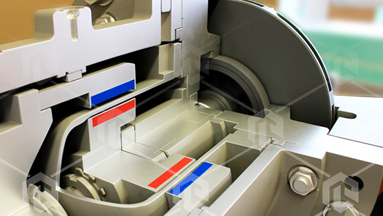 Макет имеет высокую детализацию всех конструктивных элементов насоса. Также для осмотра и изучения внутреннего устройства водяного насоса в основных его элементах сделаны вырезы.