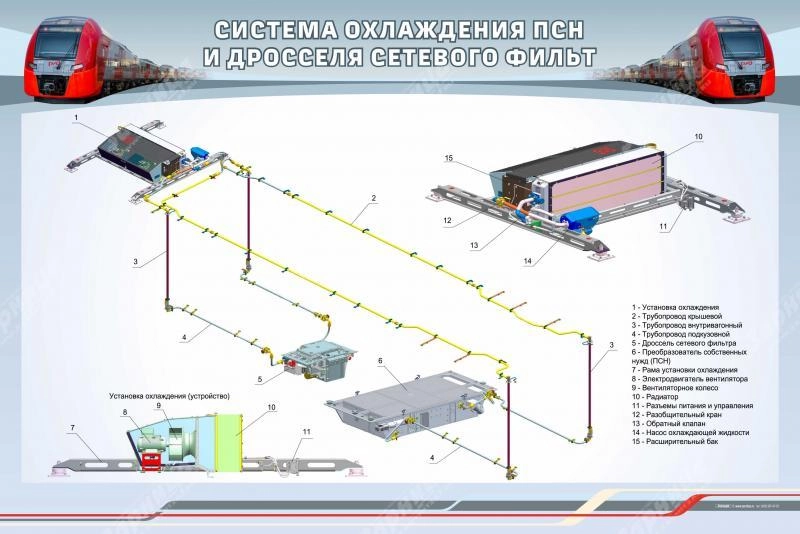 Стенд предназначен для ознакомления обучающихся в железнодорожных учебных заведениях с системой охлаждения ПСН, дросселя сетевого фильтра и подготовки, переподготовки и повышения квалификации персонала, обслуживающего высокоскоростное движение на ОАО "РЖД".