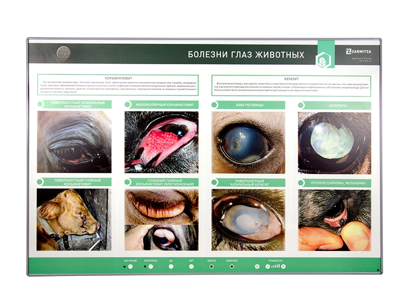 Интерактивный светодинамический стенд "Болезни глаз животных" представляет собой полноцветную светодинамическую панель, на которой представлена информация о болезнях глаз. В конструкцию учебного оборудования интегрированы высокочувствительные сенсоры для управления стендом при помощи интерактивного воздействия приемо-передающих устройств. Предусмотрено два режима работы со стендом: "Обучение" и "Контроль".