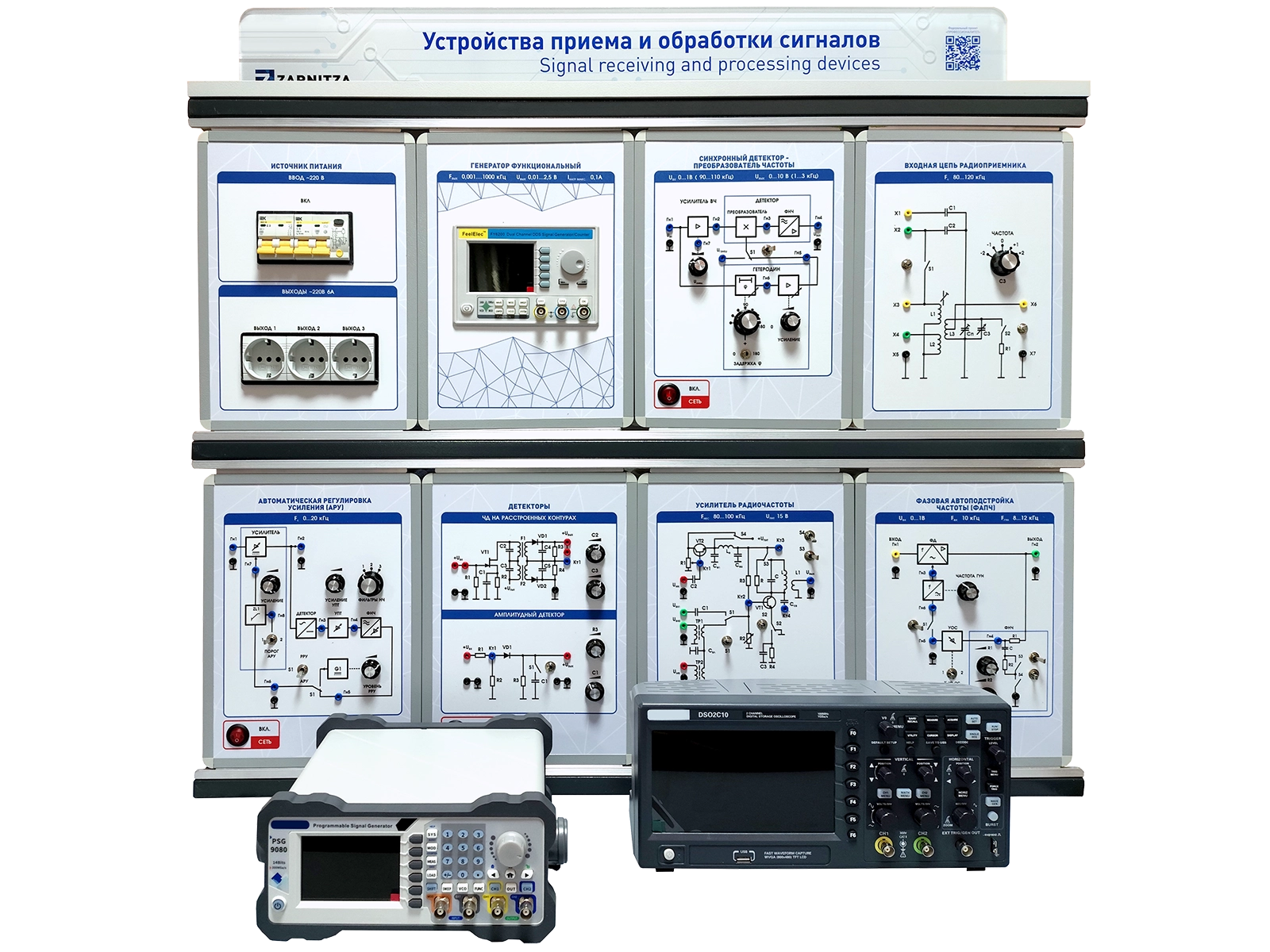 Комплект учебно-лабораторного оборудования "Устройства приема и обработки сигналов" предназначен для проведения лабораторных работ по курсу "Устройства генерирования и формирования сигналов приема и обработки сигналов".
