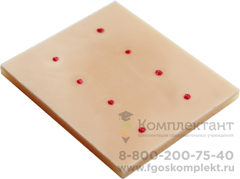 Тренажер представляет собой блок прямоугольной формы с обозначенными местами для проведения инъекций. Модуль имитирует подкожную жировую клетчатку и верхний слой кожи и предназначен для отработки навыков внутрикожных инъекций.