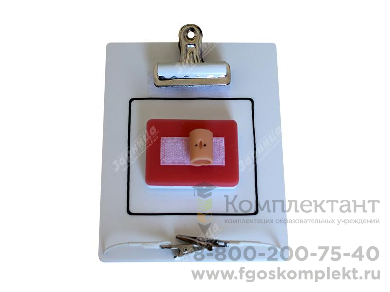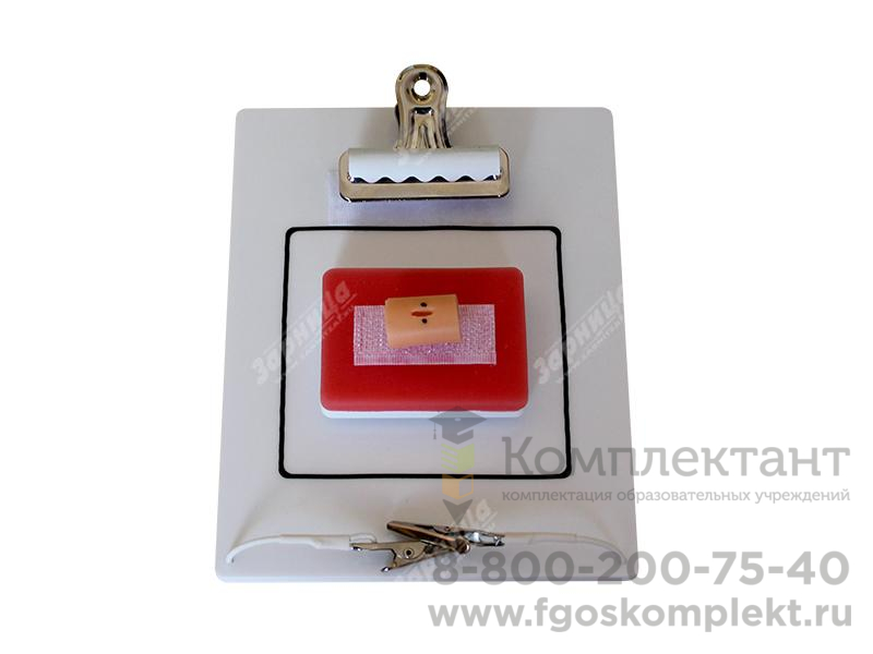 Тренажер представляет собой дренаж с имитацией раны. С помощью двух иглодержателей накладывается узел в области маркированных зон вкола и выкола.
