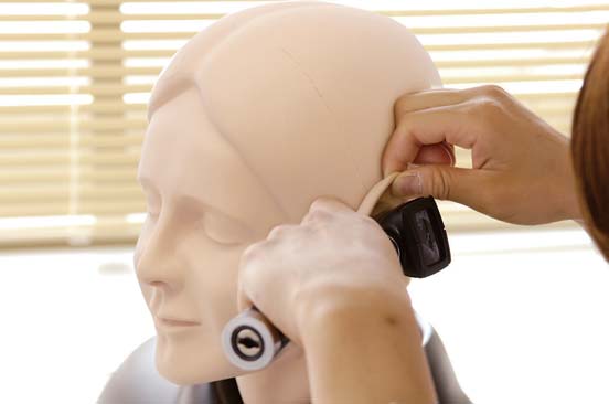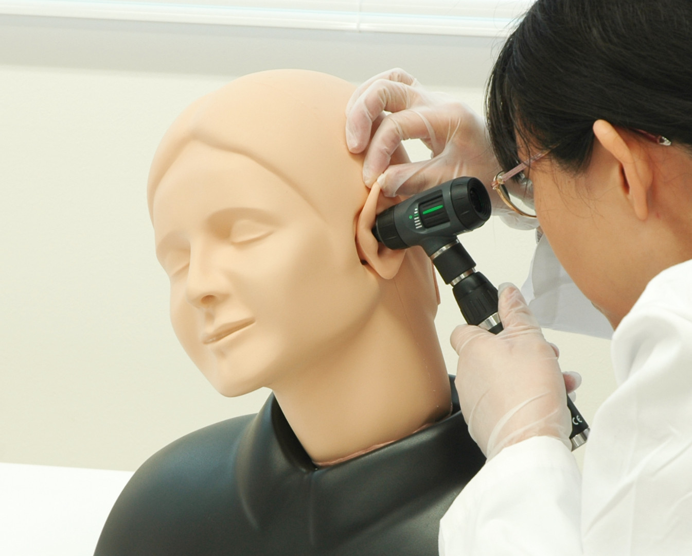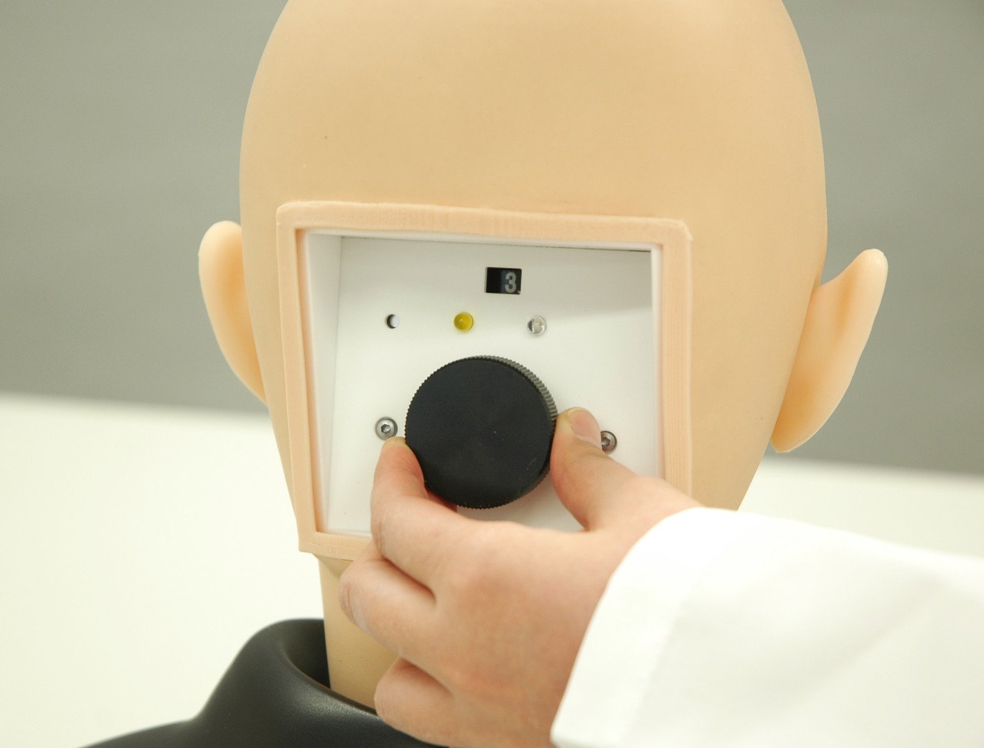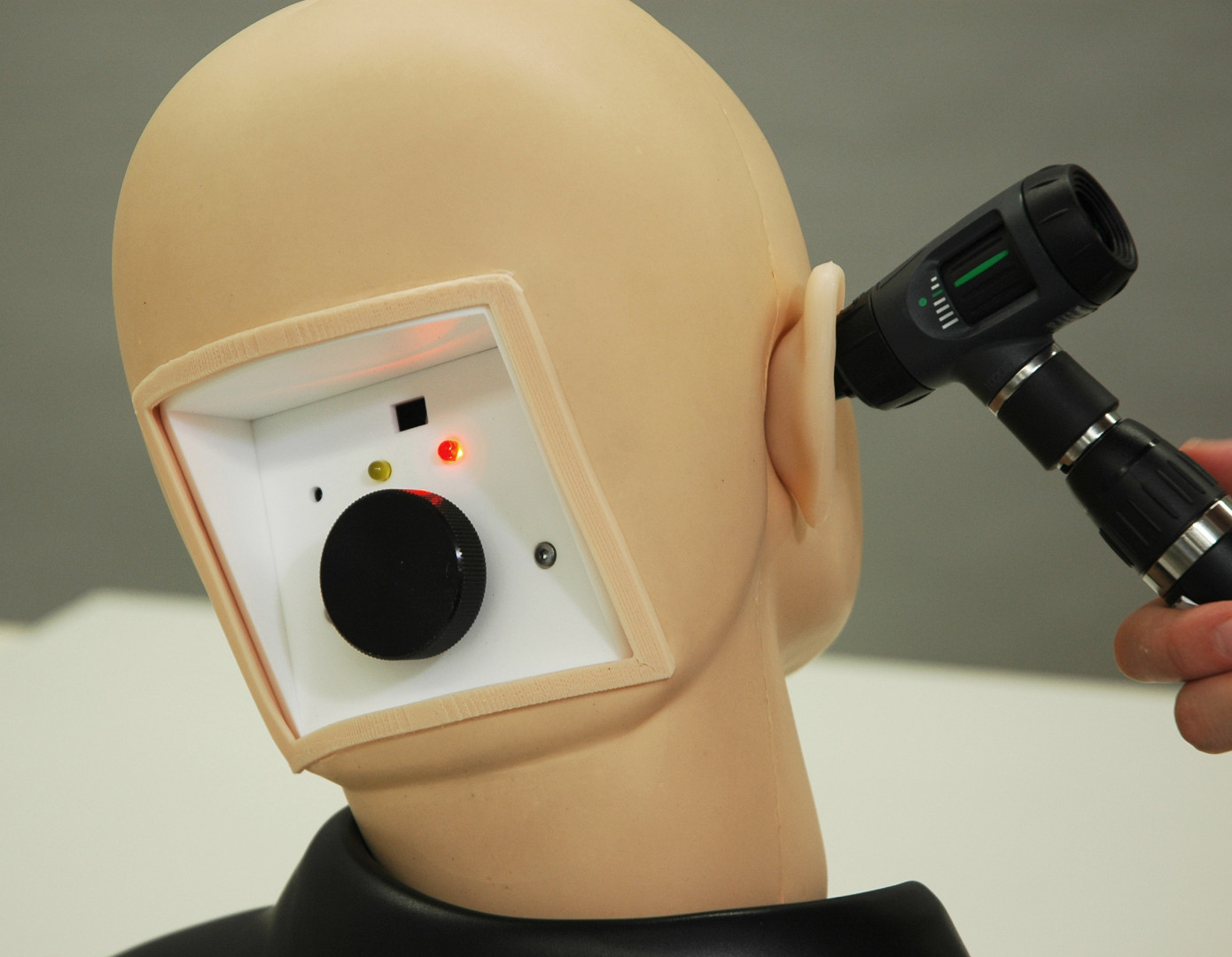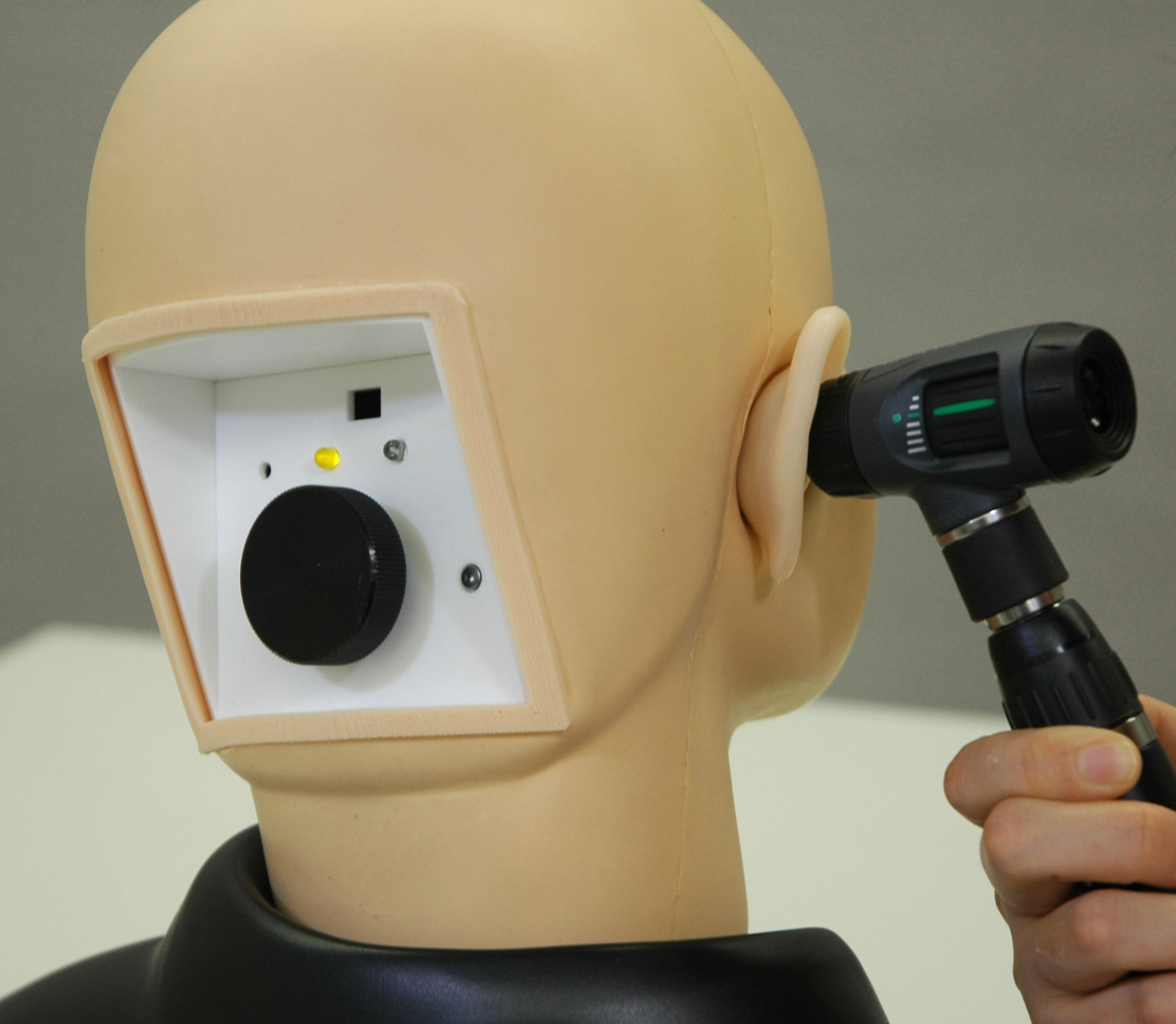 • тренажер предупреждает о слишком глубоком введении отоскопа в ухо при помощи звукового сигнала (вариант самостоятельного обучения) или красного и зеленого световых сигналов без звука (вариант обучения с инструктором)
