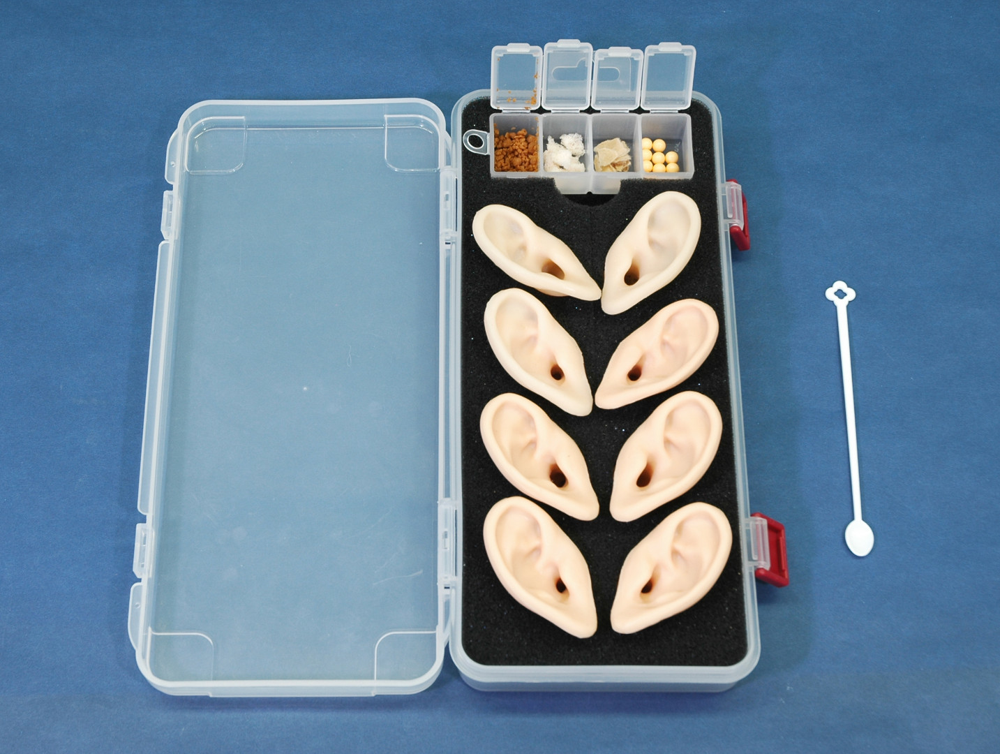 • тренажер укомплектован набором для обучения технике удаления инородных тел уха: имитированная ушная сера, мелкие предметы, мелкие кусочки губки, ложечка