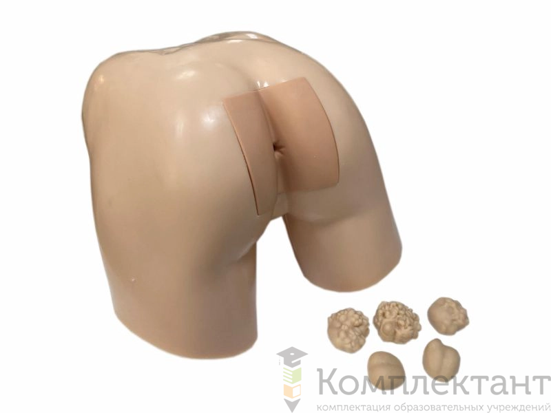 Представляет собой анатомическую модель тазового и частично бедренного отделов тела человека, исходя из общего коленно-локтевого положения. Создан максимальный доступ к ягодичной области и анальному отверстию прямой кишки. Отверстие позволяет проникнуть в полость, повторяющую по размерам и конфигурации просвет прямой кишки человека. Подбор синтетических полимеров позволил воссоздать физиологические значения сокращения наружного сфинктера прямой кишки (800-900 г) и механические свойства стенки органа. Область расположения имитированной прямой кишки находится в пределах съемного блока кубической формы, который надежно удерживается на модели. Тренажер снабжен 5 вставками (норма, одно- и двухдолевая аденома, одно- и двухдолевая карцинома).