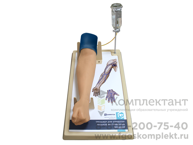 Тренажер предназначен для отработки навыков введения внутривенно игл и катетеров, вливания растворов, а также забора крови из вен локтевого сгиба и тыльной поверхности кисти. На панели изображена сетка вен и артерий, что способствует изучению анатомии верхней конечности. В комплект поставки включен электронный носитель информации с мультимедийным программным обеспечением, включающим в себя практический курс по работе с тренажером.