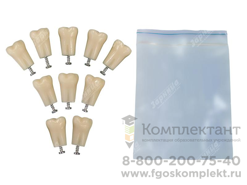 Комплект из 10 модельных зубов одного номера естественной формы с винтовым креплением для установки в денто-модели ЧВН-32. Материал зубов по своим физическим характеристикам максимально приближен к естественным.