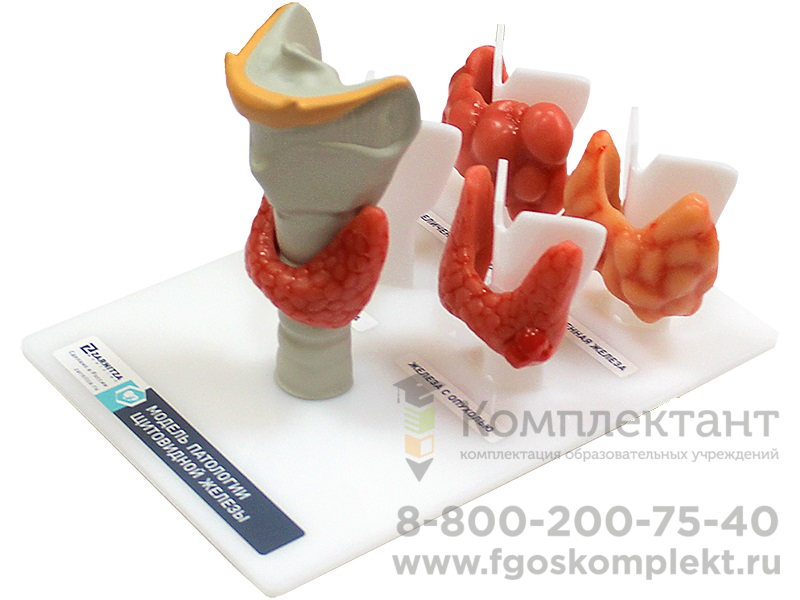 Тренажер представляет собой модель гортани с щитовидной железой, расположенную на подставке. В зависимости от поставленных задач щитовидная железа может быть заменена на тот или иной вид с патологией. Представлены следующие виды патологий: