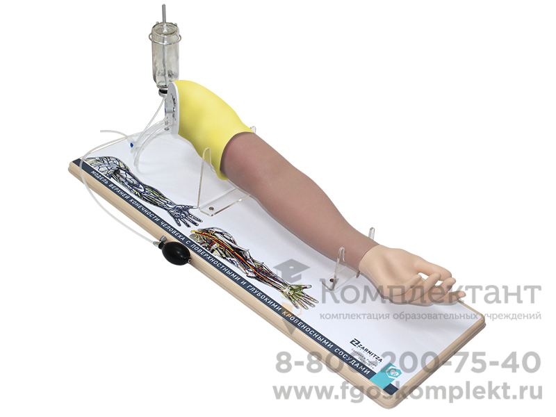 На подставке тренажера изображена сетка вен и артерий, что способствует изучению анатомии верхней конечности, также имеется кронштейн для установки емкости с имитатором крови.