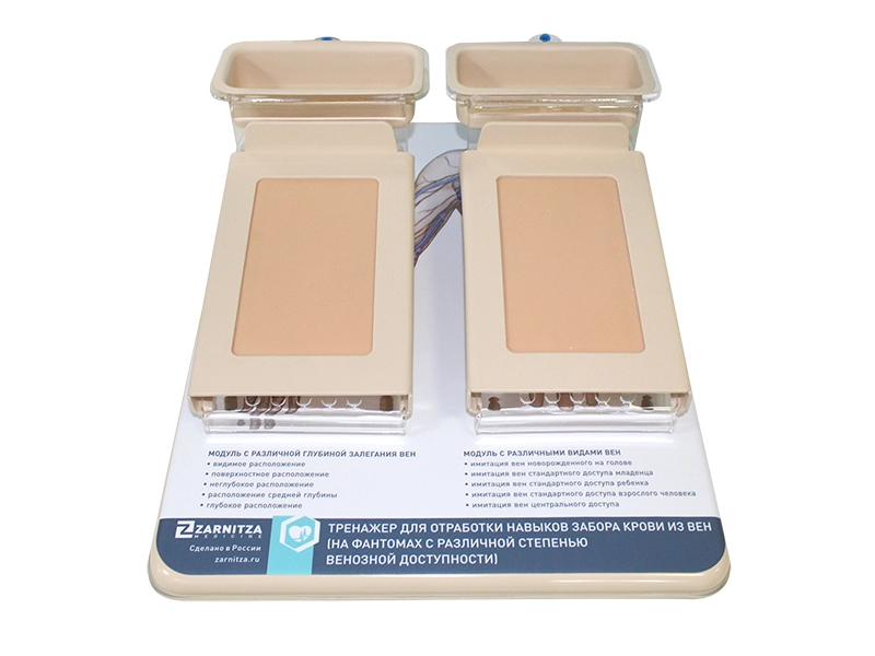 Тренажер представляет собой полноцветную панель с установленными на ней двумя имитаторами участков кожи с подкожной клетчаткой и венами, расположенными на разной глубине и имеющими разный диаметр. Предназначен для отработки навыков внутривенного доступа и забора крови.