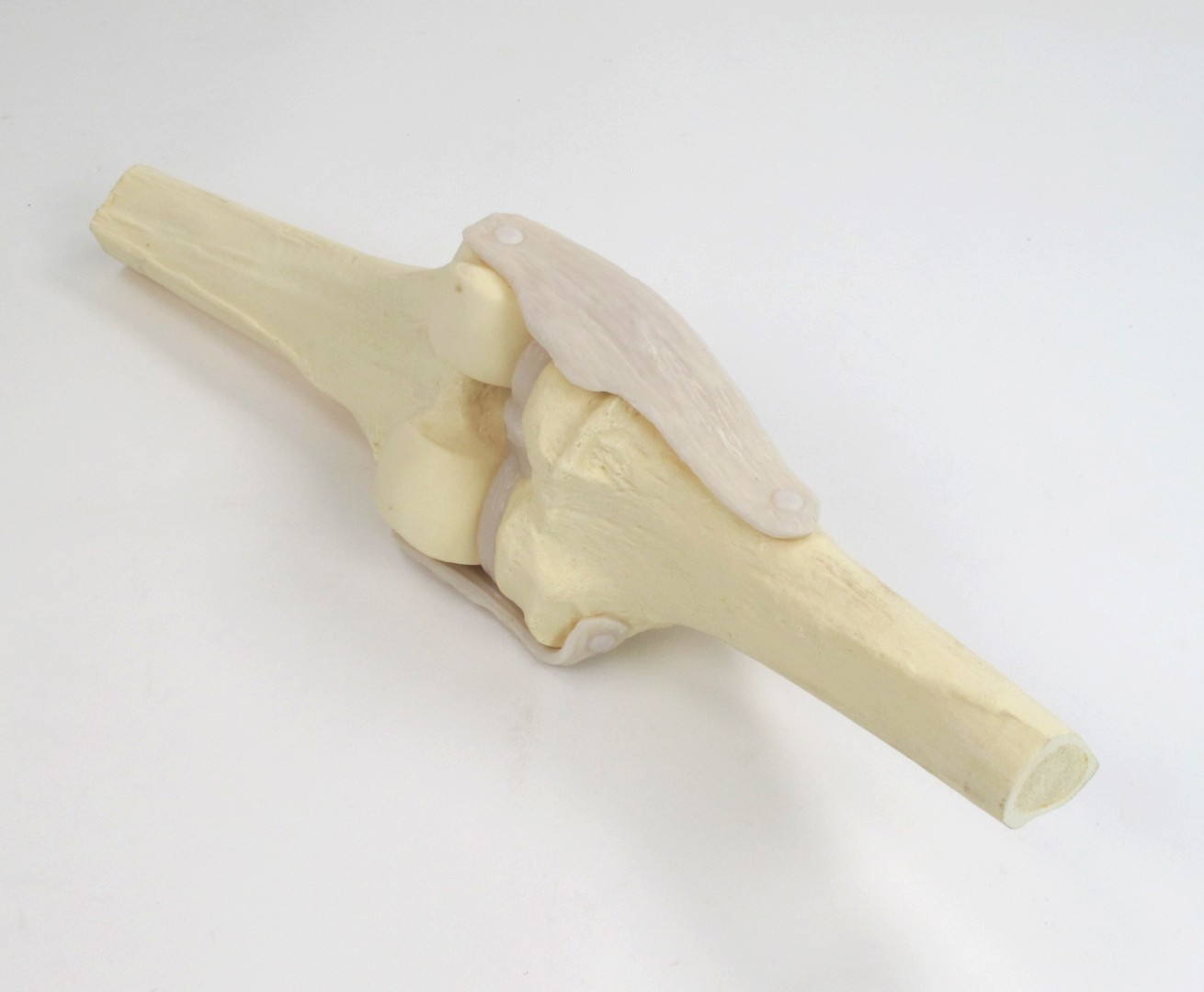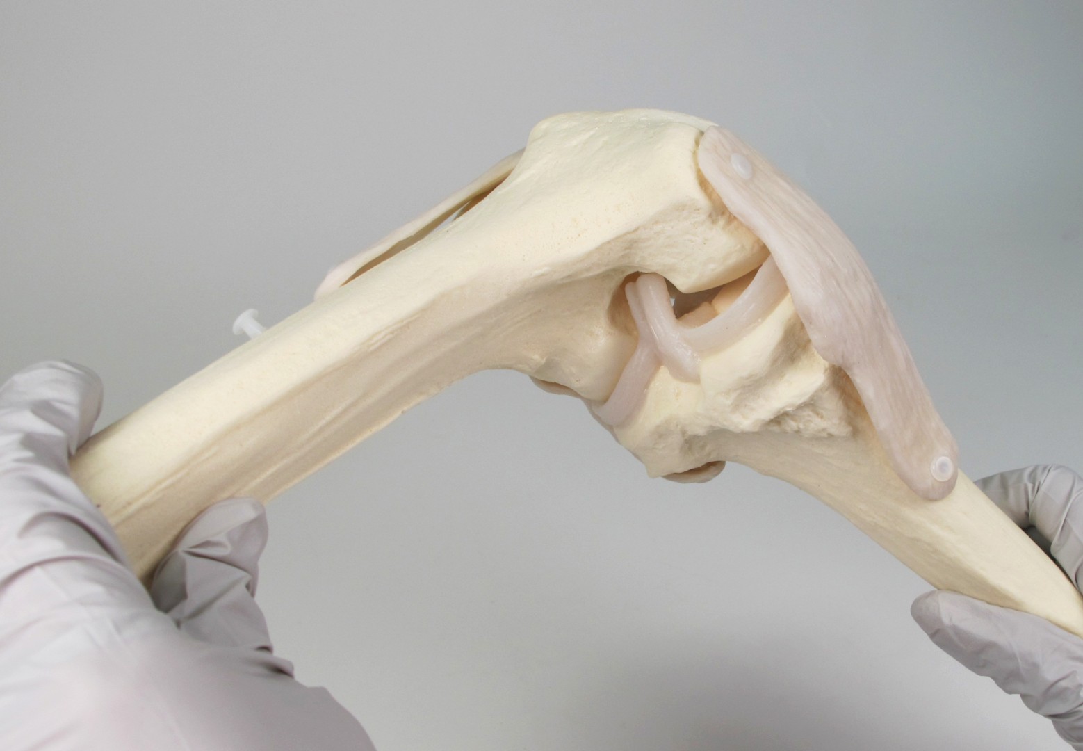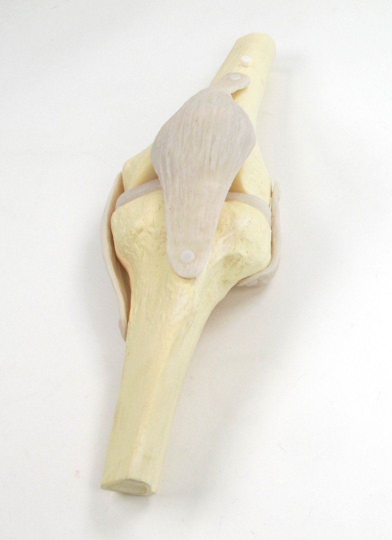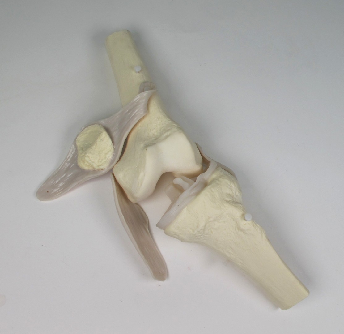 - регулируя длину сухожилия четырехглавой мышцы бедра, можно демонстрировать разгибание и сгибание колена и наблюдать движения связок и надколенника