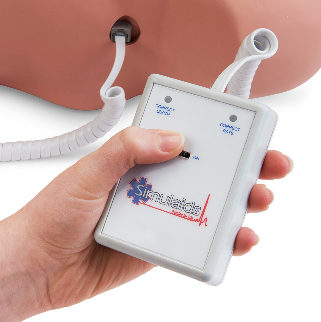 • тренажер укомплектован проводным контроллером со световыми индикаторами правильности частоты и глубины компрессий