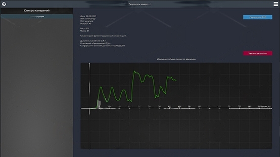 Также комплекс позволяет произвести комплекс спирометрических измерений с помощью цифрового спирометра (подключаемого к ПК) и сохранять полученные данные в файл, ассоциированный с произведенными измерениями дыхательных движений.