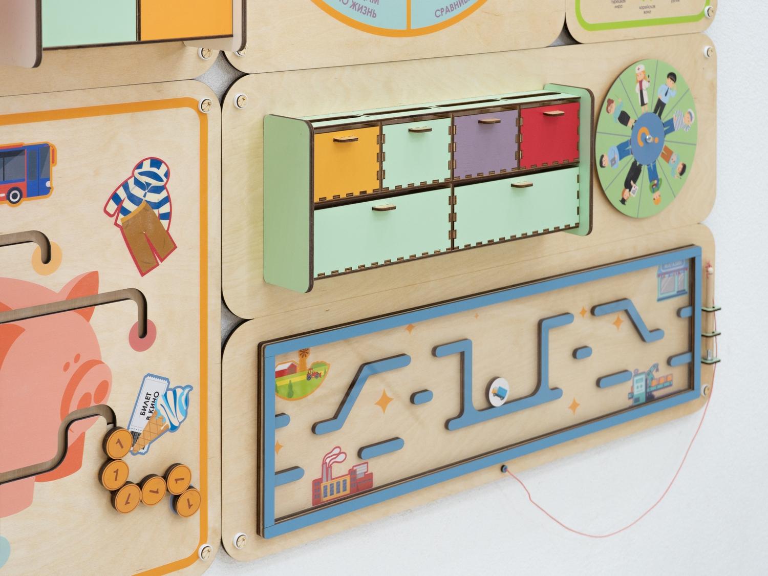 Панель увеличивает площадь полезного развивающего пространства в детском саду. Повесьте её на стену – и она не только станет незаменимым подспорьем в занятиях по финансовой грамотности, но и украсит помещение, скрывая дефекты стен.
