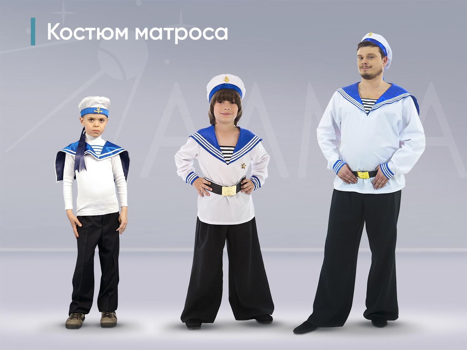 4. Костюм матроса (для малышей, детский, подростковый, взрослый). Размеры: 80-89,86-92,92-98,104-110,116-122,128-134,140-146,152-158,164-170,176,182. Цвет: белый с синим.