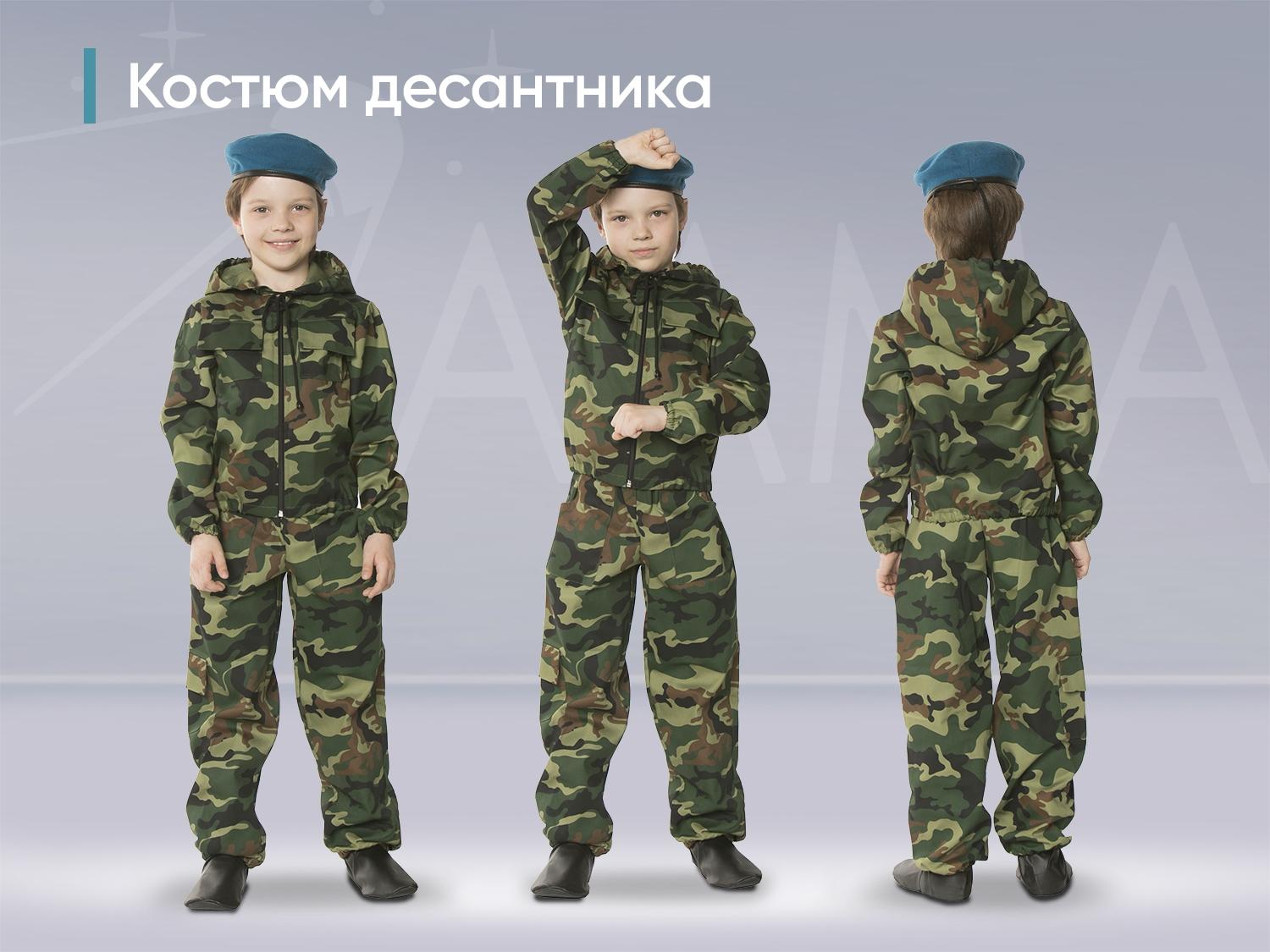 1. Костюм десантника. Размеры: 104-110,116-122,128-134,140-146. Цвет: камуфляж, хаки.