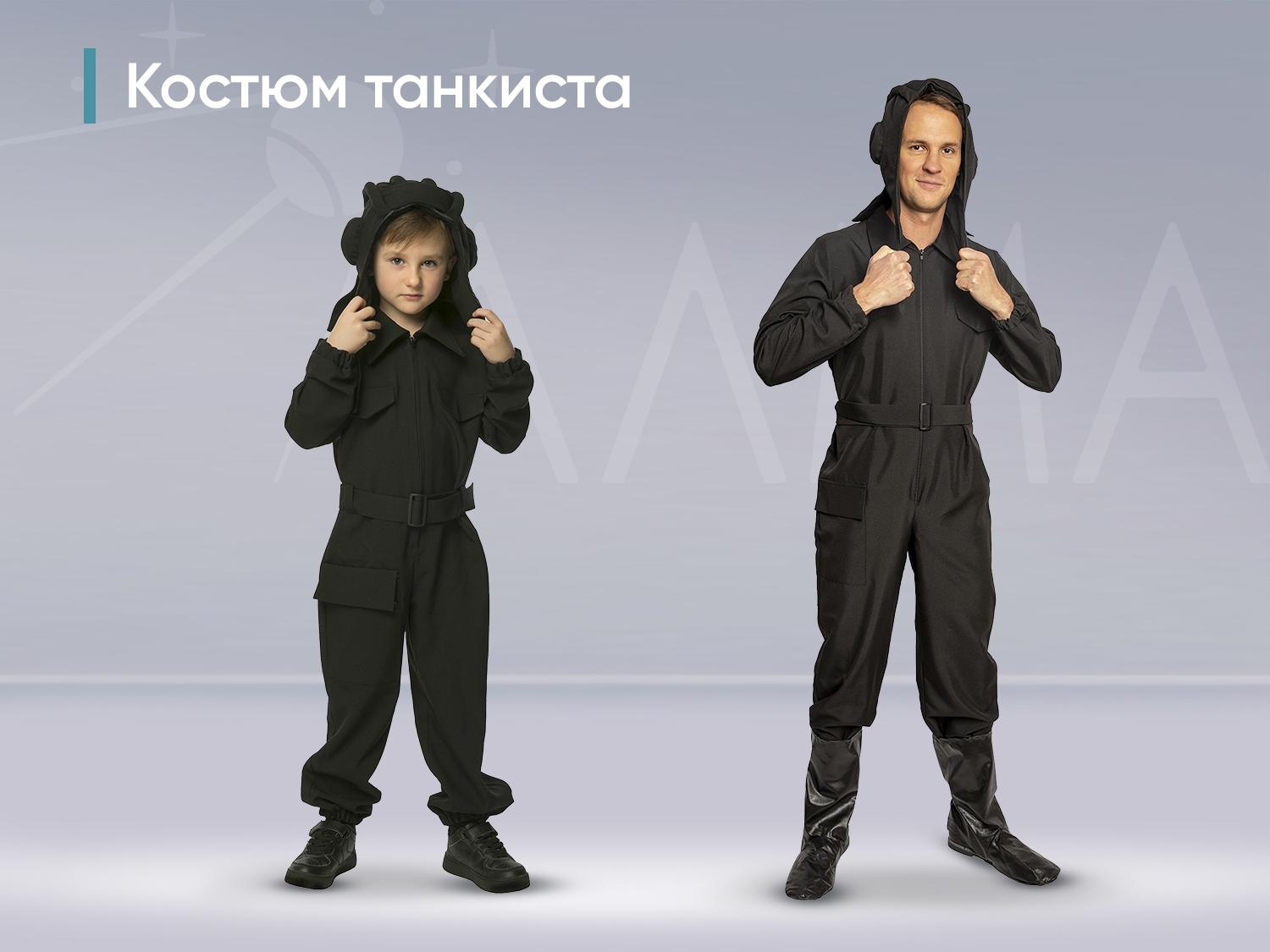 5. Костюм танкиста (детский, подростковый, взрослый). Размеры: 104-110,116-122,128-134,140-146,152-158,164-170,176,182. Цвет: чёрный.