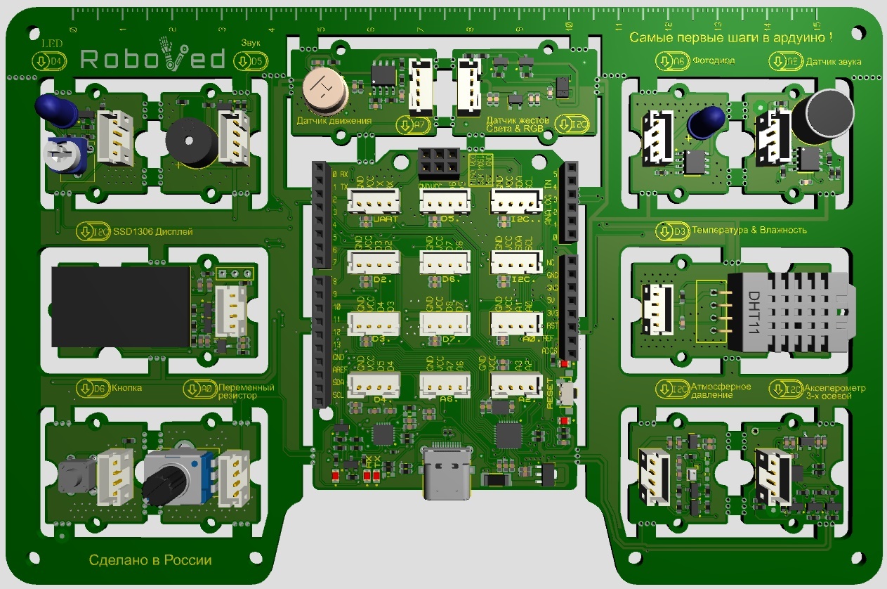 Комплекс представляет собой единую плату, на которой смонтированы 15 самых популярных датчиков для реализации проектов. Каждый элемент может быть извлечен и работать как самостоятельный датчик.