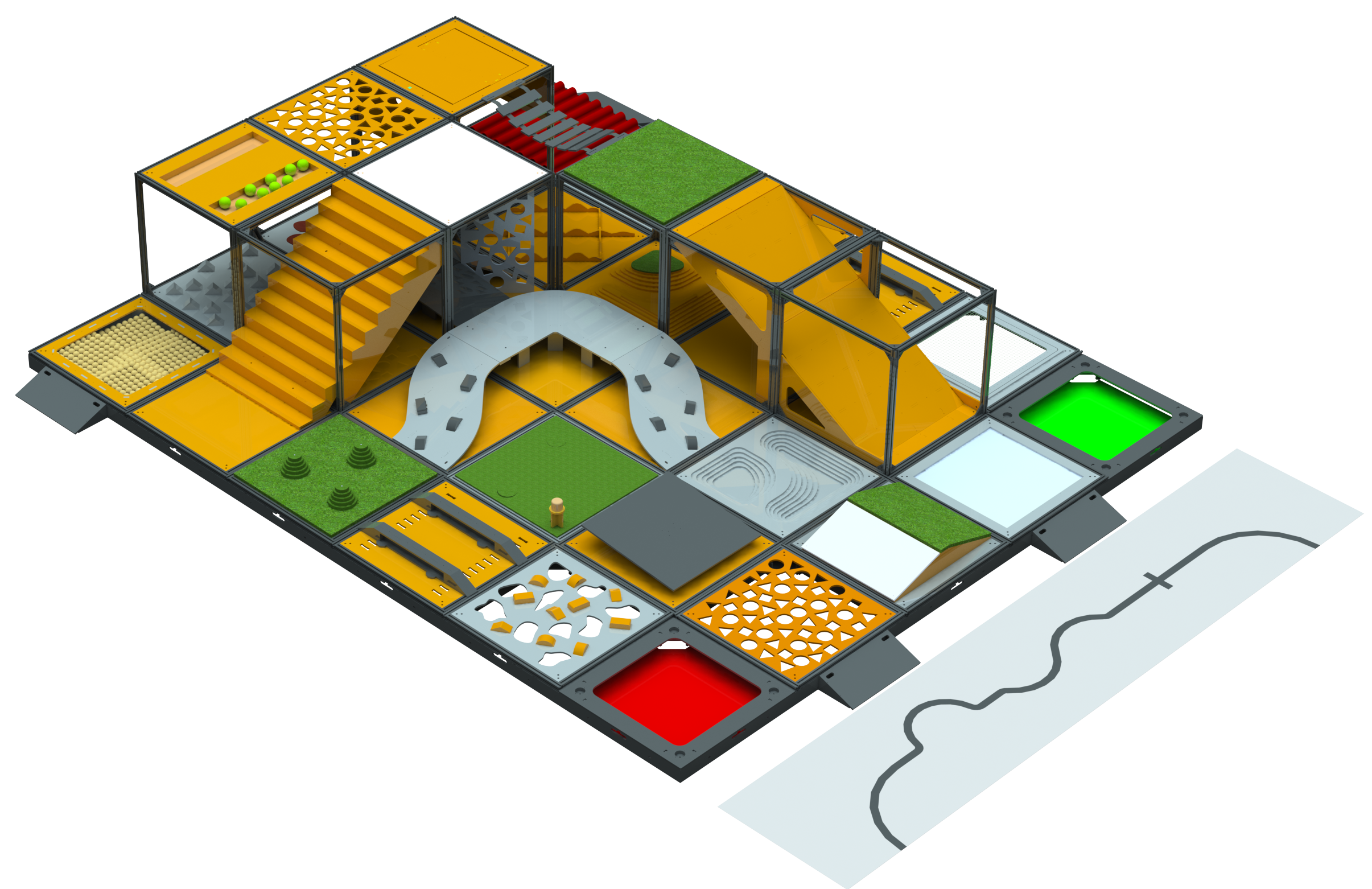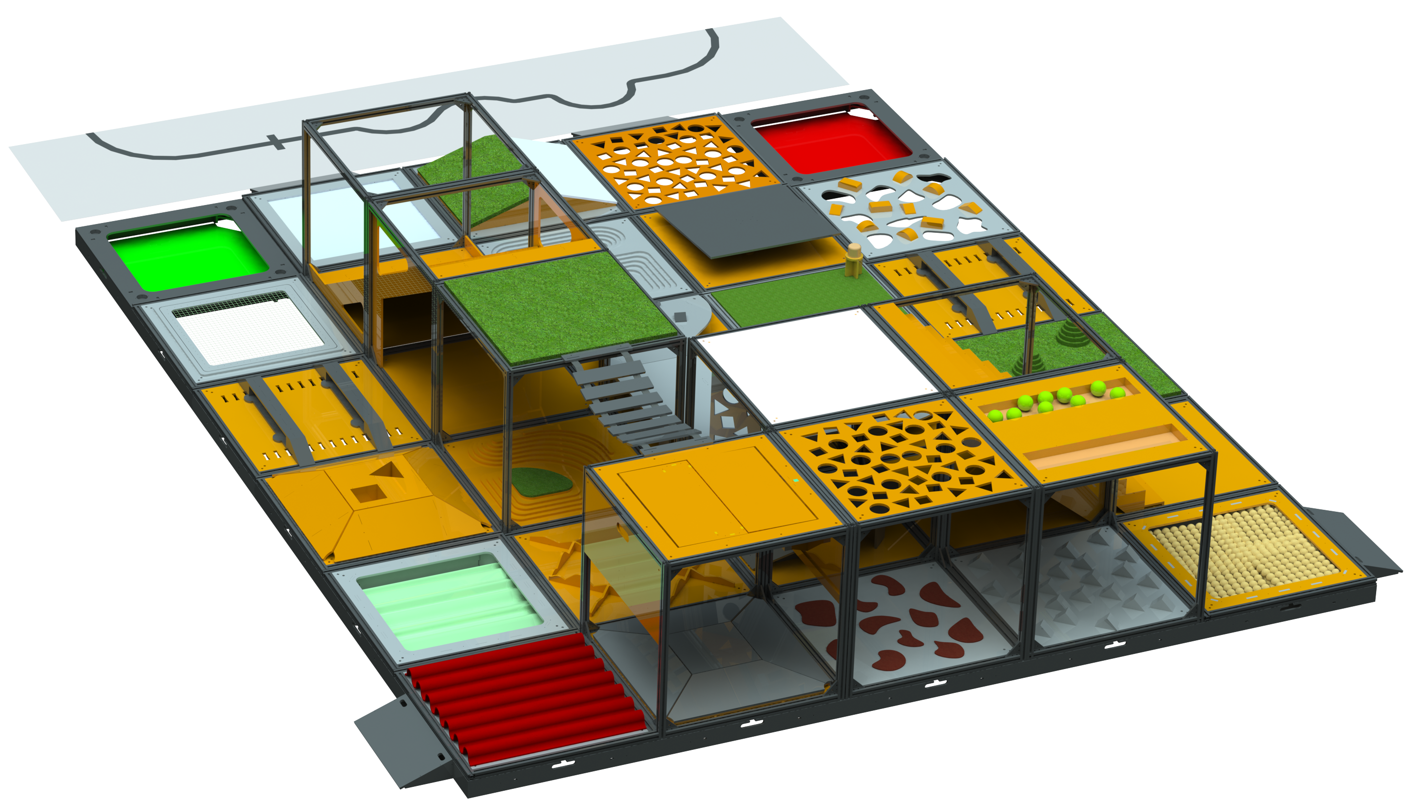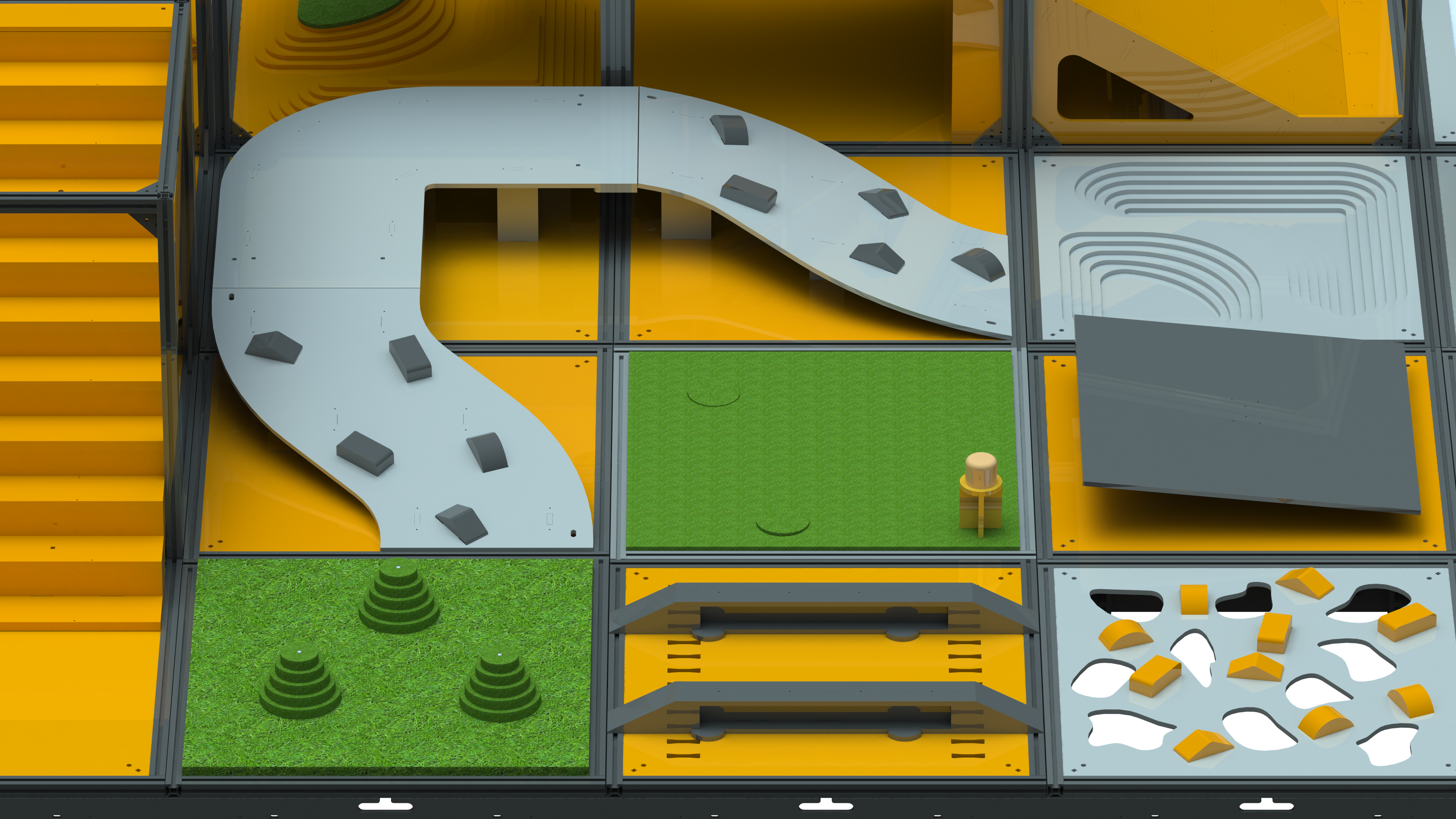 Испытательный полигон «РТК» представляет собой реконфигурируемую полосу препятствий, составными элементами которой являются 30 различных ячеек с испытаниями и заданиями, преодоление или выполнение которых позволяет оценить возможности мобильных роботов.
