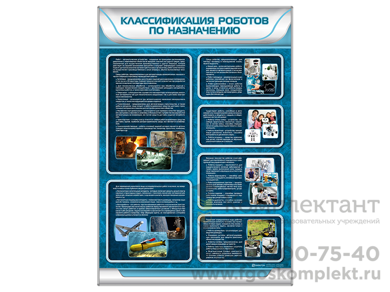 Стенд "Классификация роботов по назначению" – наглядное пособие для изучения современных технологий. Идеально подходит для школ и вузов, помогает лучше понять разнообразие робототехники и ее применение.
