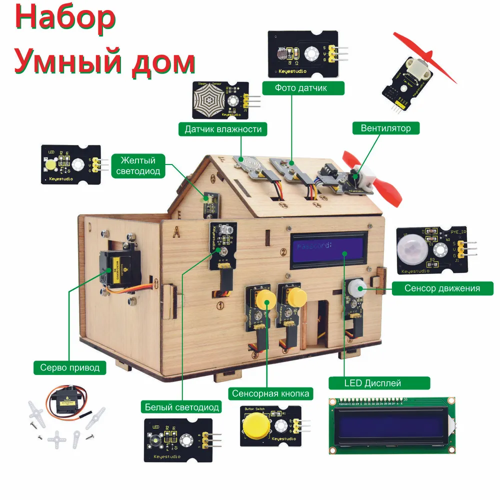 Этот обучающий комплект для умного дома, основанный на платформе Arduino. Он имитирует настоящий умный дом и демонстрирует уютную и комфортную жизнь для людей.