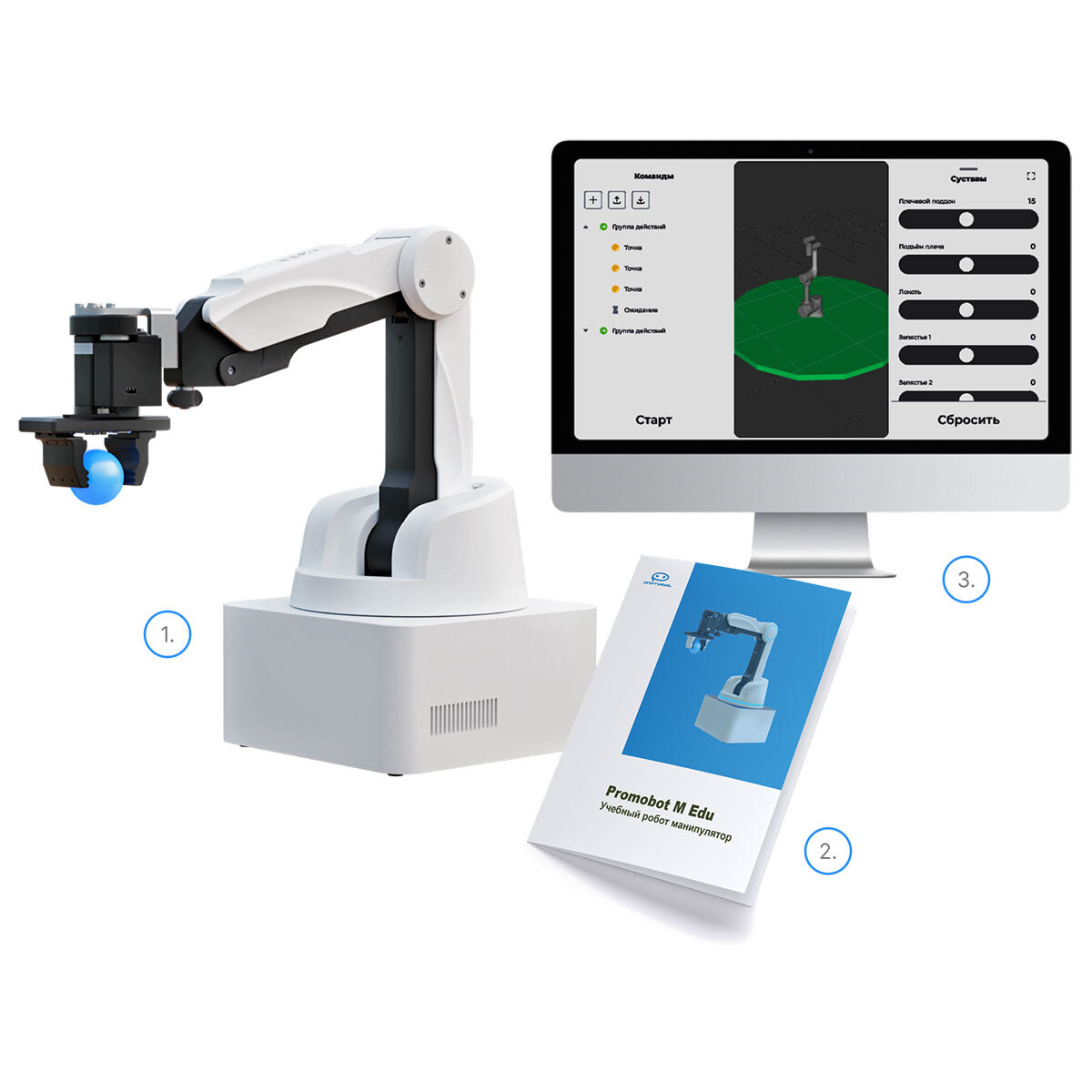 Аппаратно-программный робототехнический комплекс PROMOBOT M EDU - многофункциональный настольный четырехосевой робот-манипулятор с набором сменных рабочих инструментов и дополнительных устройств, программным обеспечением для управления, программирования и отслеживания действий манипулятора. Учебный манипулятор позволяет изучить робототехнику, автоматизацию производств и программирование на практике: Робот быстро встраивается в образовательный процесс за счет интуитивно понятного интерфейса управления. Специально разработанные методические материалы трех уровней сложности позволяют начать осваивать робототехнику учащимся разного возраста и уровня подготовки. Решение является полностью российской разработкой. Преимущества: