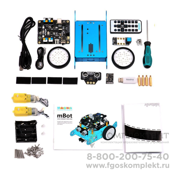 Тип: Робототехнический конструктор. Состав: Моторы. Микроконтроллер mCore. Пластиковые колеса на 90 зубчиков. Шины на колеса. Липучка Velcro. Латунные шпильки. Шасси/корпус. Батарейный отсек. Универсальное колесо. Винты. Гайки. Саморезы. Кабеля. Отвертки. Ультразвуковой сенсор/датчик. Датчик следования по линии. Модуль для компьютера. Модуль для робота. ИК-пульт управления. Инструкция по сборке робота.Карта/рисунок для тестирования и следования по линии.