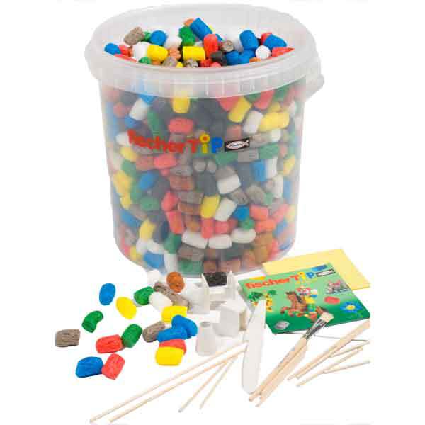 Ведро fischerTIP включает 1000 разноцветных подушечек, специальную губку, пластмассовый ножик, кисточки и палочки, а также инструкции.