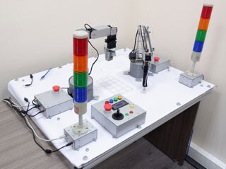 Учебный комплект для изучения манипуляционных роботов и промышленной автоматизации представляет собой учебно-лабораторный макет автоматизированной робототехнической ячейки или «умной фабрики», предназначенный для применения в общеобразовательных учреждениях, учреждениях СПО и ВУЗах, а также детских технопарках и других учебных заведений для преподавания основ робототехники и промышленной автоматизации. Учебно-лабораторный макет автоматизированной робототехнической ячейки представляет собой робототехнический комплекс на базе манипуляционного РТК с угловой кинематикой, манипуляционного РТК с плоско-параллельной кинематикой и комплекта "смарт-устройств", управляемого с помощью клиент-серверного ПО, устанавливаемого на персональный компьютер учащегося. Применение РТК в образовательном процессе позволяет познакомить учащихся с принципами проектирования и конструирования манипуляционных роботов, основам разработки управляющего ПО и базовым принципам построения архитектур систем управления гибких производственных ячеек. Учебный манипулятор с угловой кинематикой предназначен для перемещения и ориентации объектов в пространстве со сферической системой координат и имитации технологических операций. Учебный манипулятор реализован на основе интеллектуальных сервоприводов с последовательным коммуникационным интерфейсом управления, оснащенных трехконтурной системой управления с настраиваемыми параметрами регуляторов. В состав комплекта входит: Сервоприводы 6 шт; программируемый контроллер с интегрированным одноплатным микрокомпьютером с поддержкой интерфейсов Ethernet и WiFi для коммуникации со смарт устройствами; вычислительный "смарт"-контроллер и периферийная плата для реализации "смарт-устройств" и беспроводной коммуникации между ними; модуль управления вакуумным захватом. Учебный манипулятор с плоско-параллельной кинематикой предназначен для перемещения и ориентации объектов в пространстве с цилиндрической системой координат и имитации технологических операций. Учебный манипулятор реализован на основе интеллектуальных сервоприводов с последовательным коммуникационным интерфейсом управления, оснащенных трехконтурной системой управления с настраиваемыми параметрами регуляторов. В состав комплекта входит: Сервоприводы 6 шт; программируемый контроллер с интегрированным одноплатным микрокомпьютером с поддержкой интерфейсов Ethernet и WiFi для коммуникации со смарт устройствами; вычислительный "смарт"-контроллер и периферийная плата для реализации "смарт-устройств" и беспроводной коммуникации между ними; модуль управления вакуумным захватом. Комплект "смарт"-устройств совместим с учебными манипуляторами и прочим оборудованием, входящим в макет автоматизированной робототехнической ячейки. В состав комплекта смарт-устройств для разработки макета производственной линии входит: Состав комплекта:
