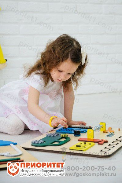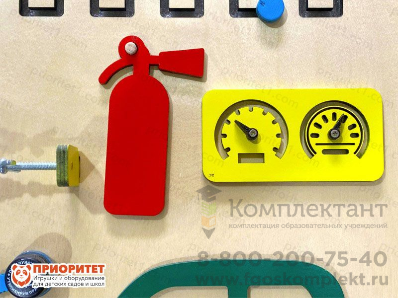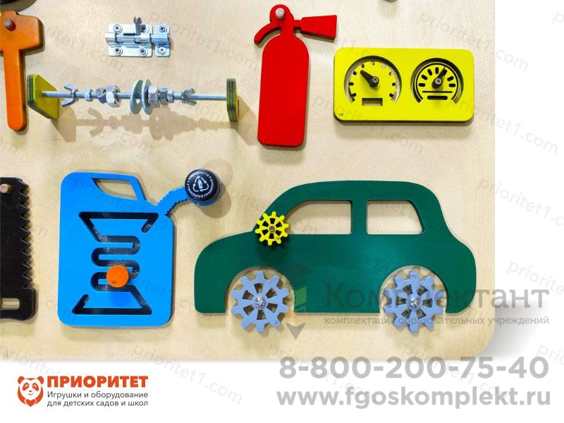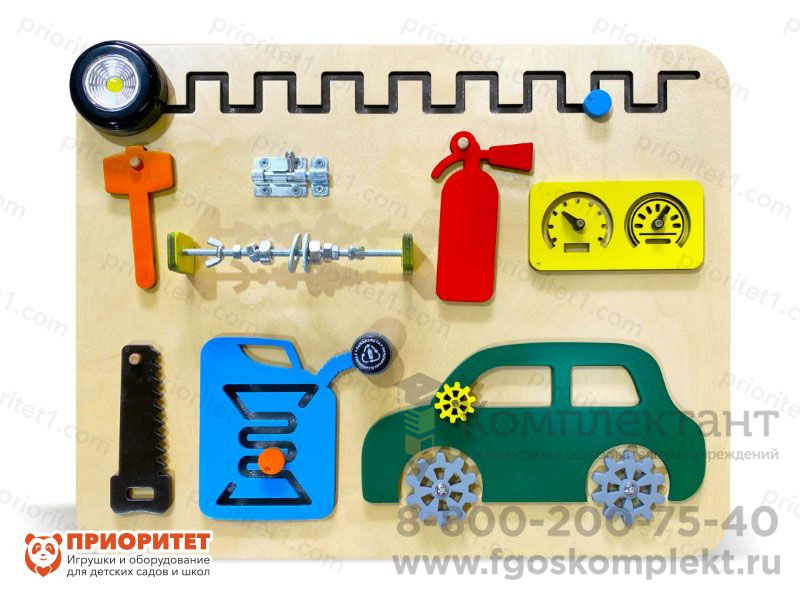 Бизиборд выполнен в гаражном стиле. Панель познакомит ребят с такими предметами, как велосипед, инструменты, колеса и т.д. Бизиборд является полезным тренажером для моторики рук. Каждая деталь стимулирует тактильные ощущения и мыслительные процессы. Элементы расположены на нейтральном фоне, благодаря чему внимание ребенка акцентируется именно на деталях. Бизиборд подходит для занятий с детьми в детских садах, развивающих дошкольных учреждениях, игровых и коррекционных центрах и т.д.