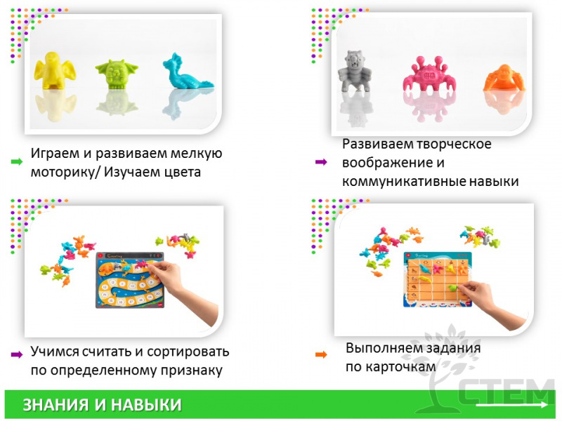 Счетный материал «Монстры» - весёлый образовательный набор, предназначен для развития мелкой моторики, математических способностей, навыков счета и сортировки по определенному признаку, развивает усидчивость и терпение.