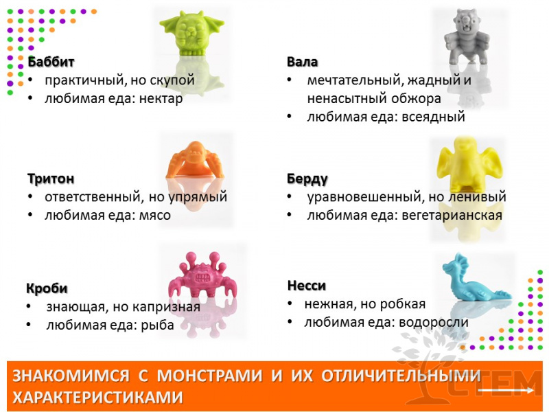 - 72 фигурки в виде Монстров, 6-ти природных цветов.