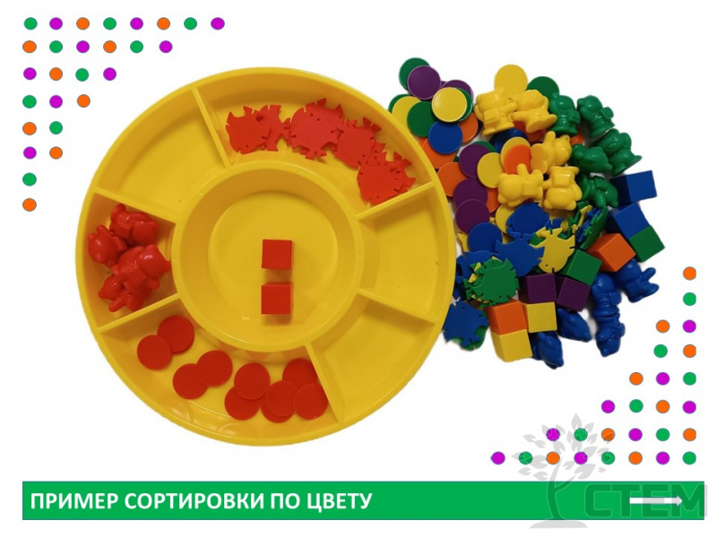 Это развивающая логическая игра, в которой нужно сортировать предметы по определенному признаку – цвету, форме, типу или размеру.
